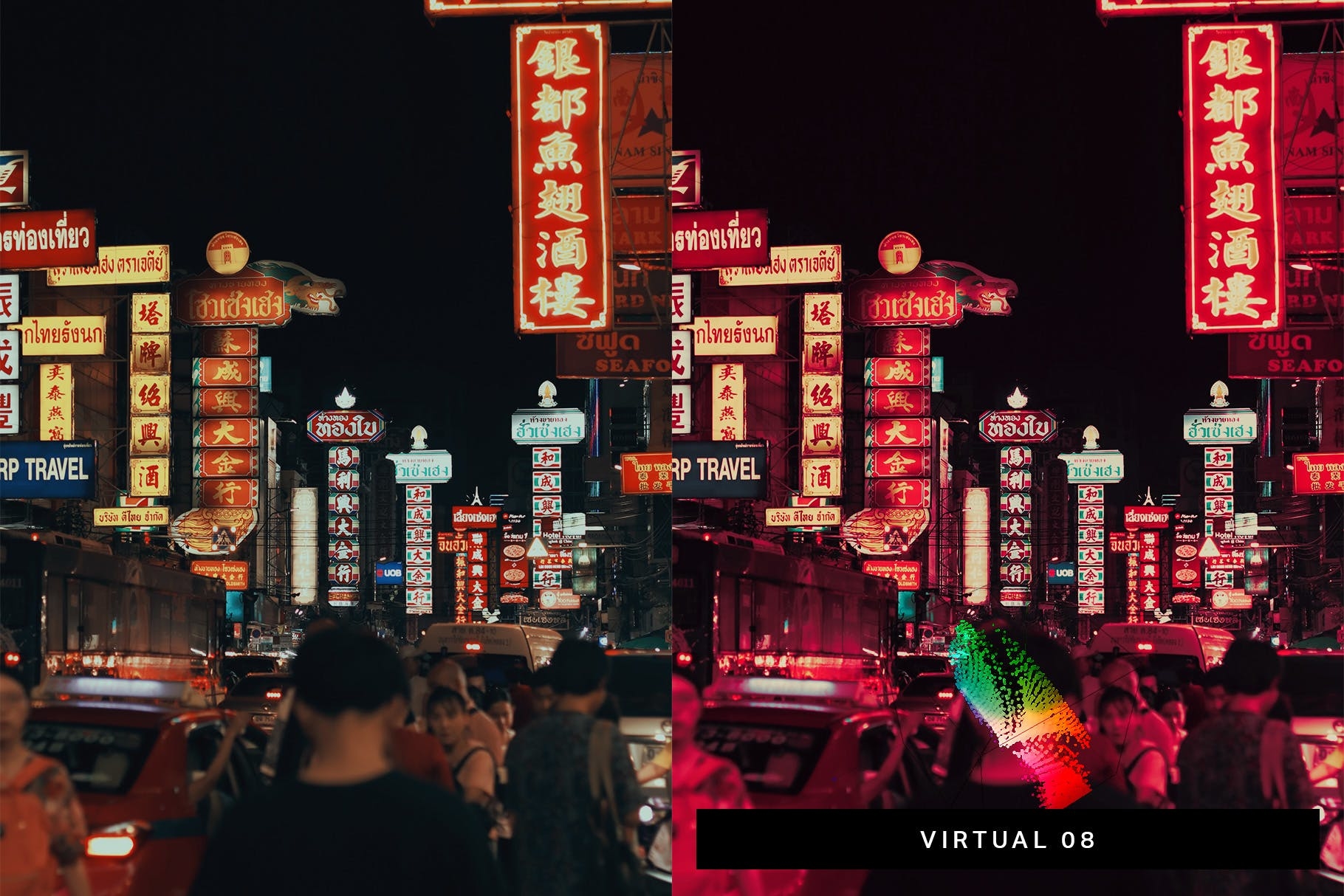 - 10种虚拟预设-色彩艳丽,偏向青色和洋红色的明亮梦幻风格。