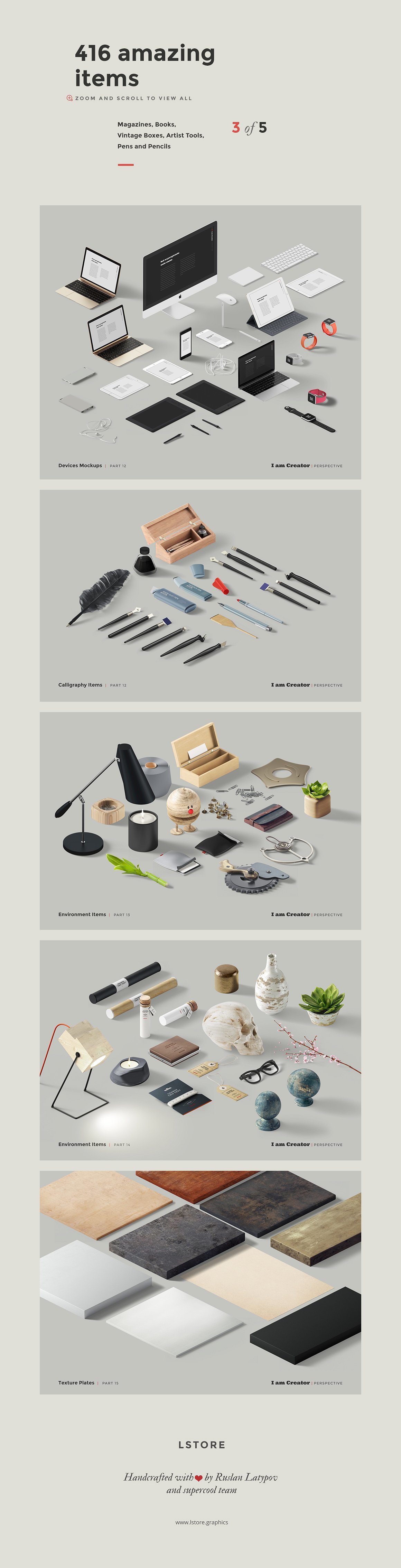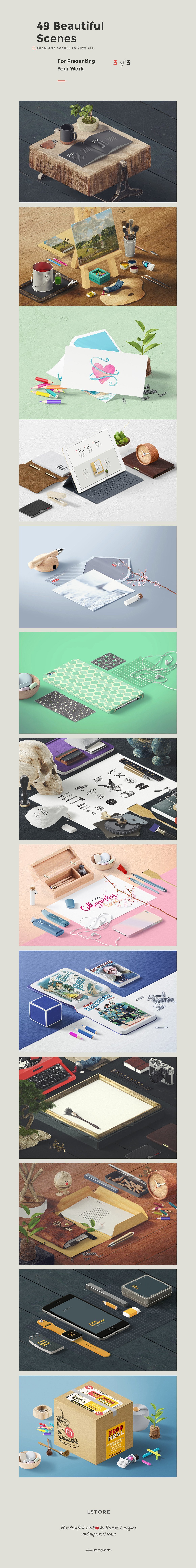 DIY模拟场景样机帮助设计快速创建自己的独特场景,只需拖拽项目到一个特殊的场景。选择一个背景,删除你喜欢的项目,并通过选择预制的调整层完成场景。