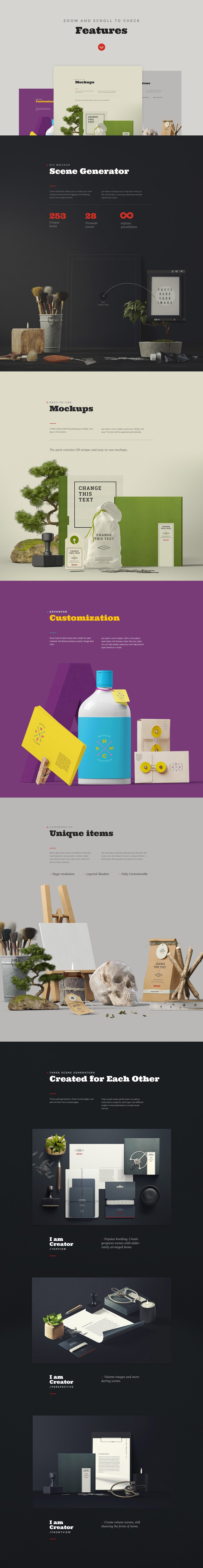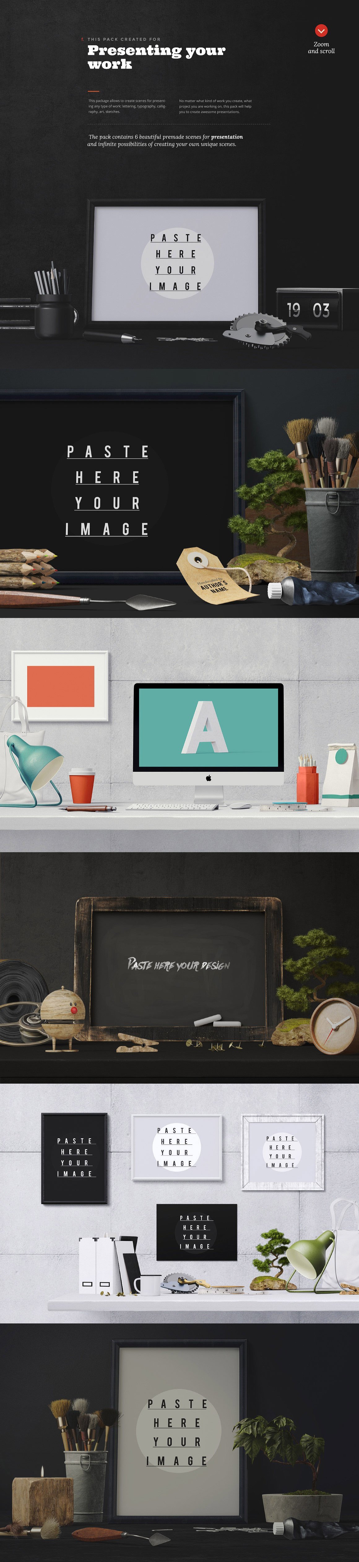 模拟场景样机帮助设计快速创建自己的独特场景,只需拖拽项目到一个特殊的场景。选择一个背景,删除你喜欢的项目,并通过选择预制的调整层完成场景。