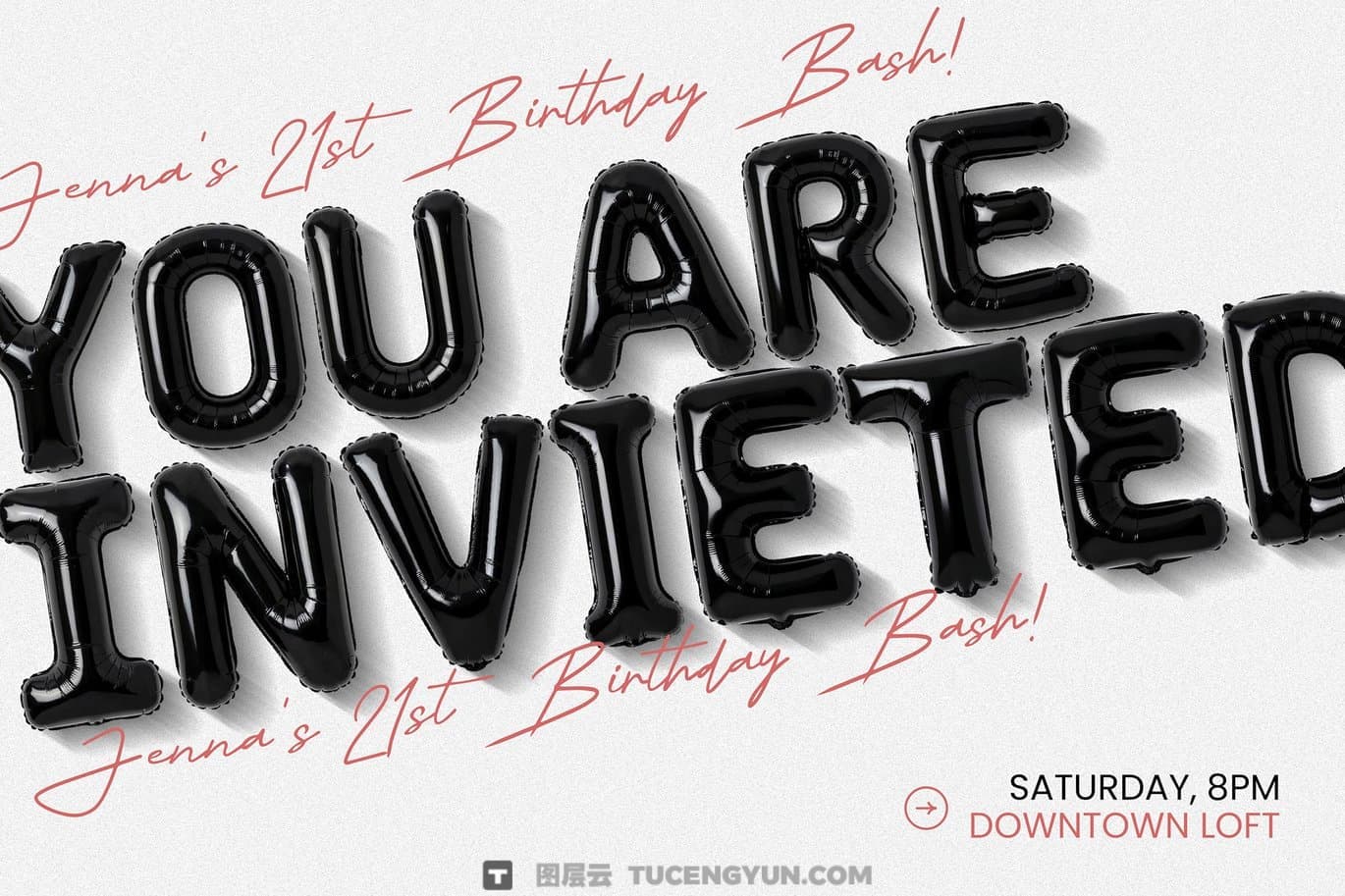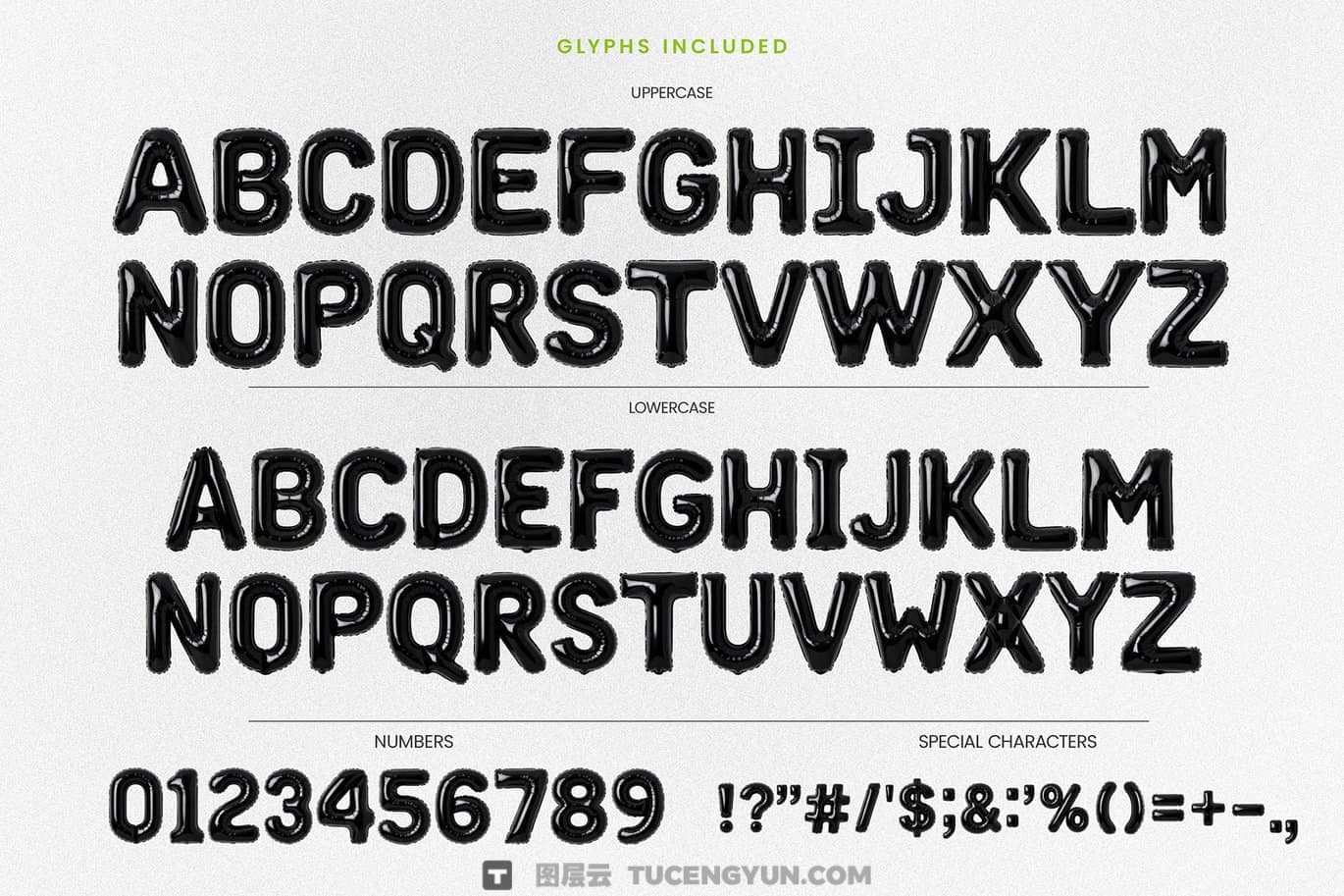 用黑色箔气球字体为你的设计增添即时派对氛围和高端光泽!这款字体捕捉了真实锡箔气球那光滑、皱褶的质感。无论你是为生日、黑色星期五促销,还是现代街头服饰品牌设计,这款字体都能在屏幕上带来那种“亮点”。