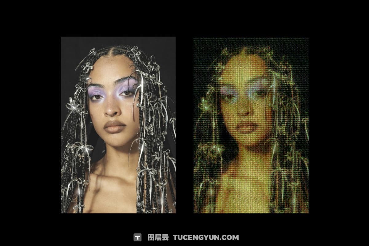 像素网格拆分、扫描线纹理和噪点RGB边缘效果,让你的图像呈现出截屏的感觉。这种效果让人联想到暂停的直播、摄像机静帧画面,或深夜桌面窗户。它非常适合音乐封面艺术、巡演海报、俱乐部传单、游戏视觉效果、直播缩略图、时尚时尚专题、科技品牌活动、杂志、社交广告和活动宣传。