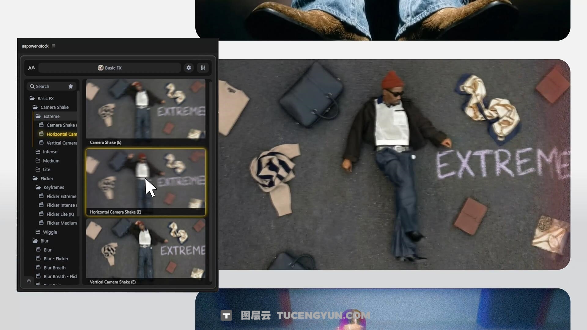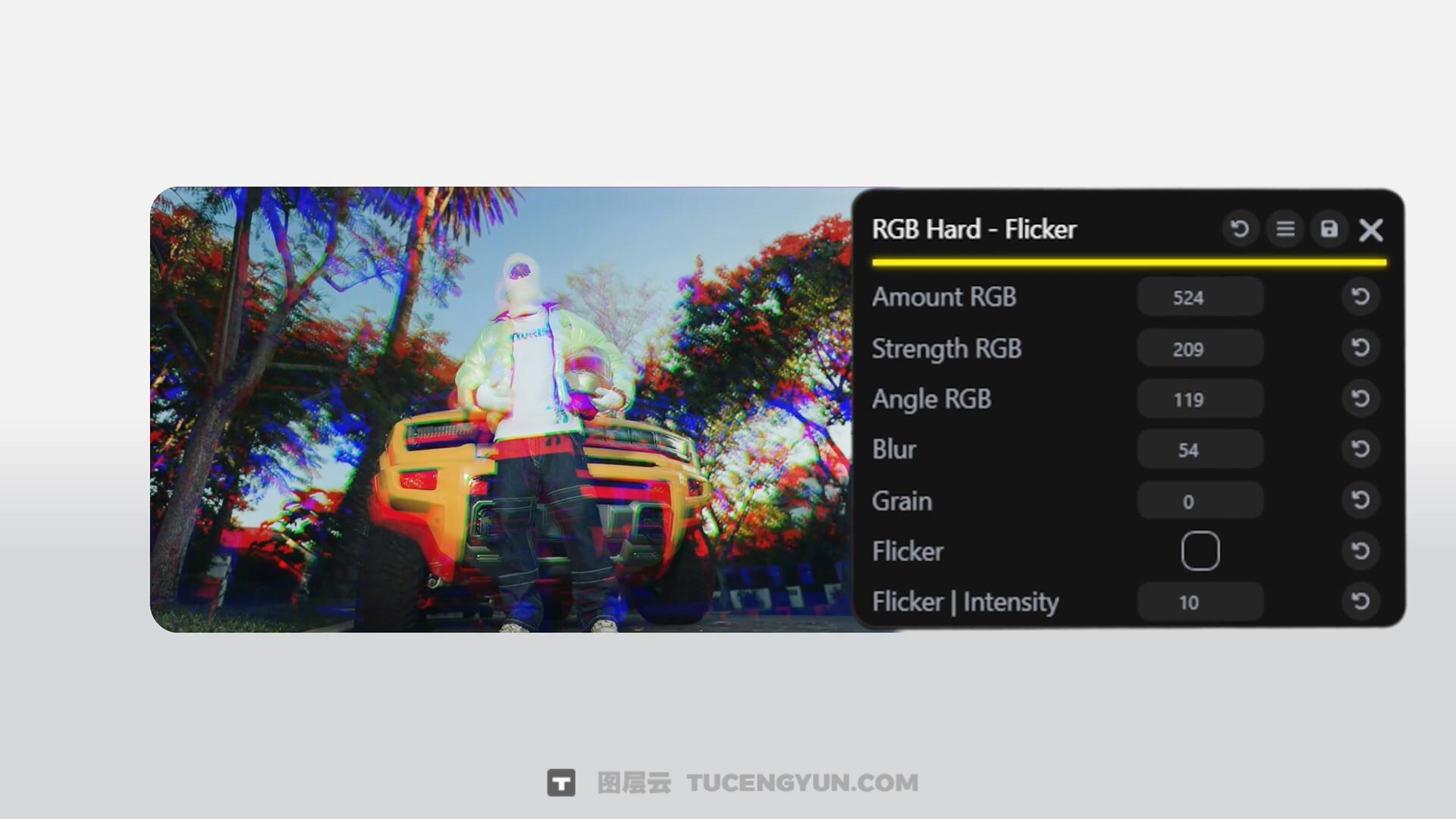 - 核心特效类别:相机抖动 / 闪烁 / 模糊 / 鱼眼 / 发光 / RGB