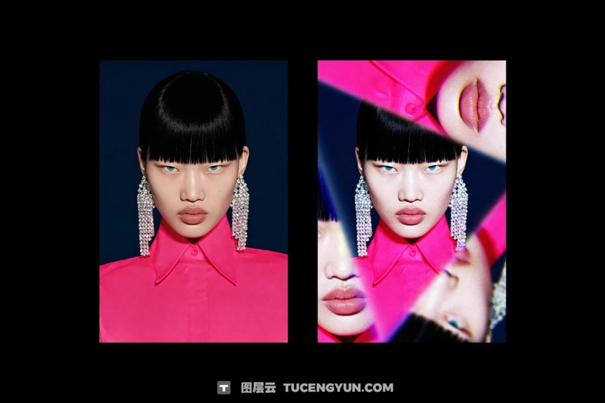 玻璃状碎片切割画面,并以锐角映照主体。它为音乐艺术作品、夜生活海报、时尚、美容专题、杂志封面和社会活动预告片营造出紧张的氛围。肖像展现出万花筒般的张力,产品镜头则增添了光滑、窥视的锋芒。套装包含2个高质量的PSD 文件,纵横布局,方便在印刷和数字版面上灵活放置。编辑通过智能对象完成。