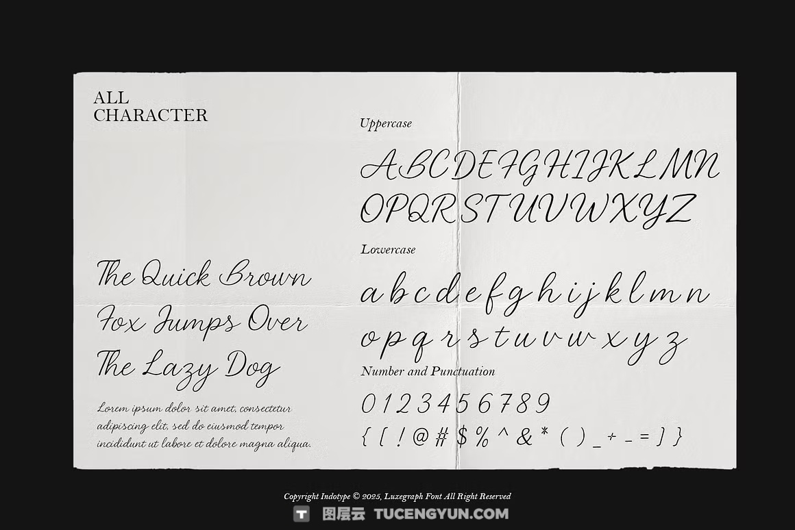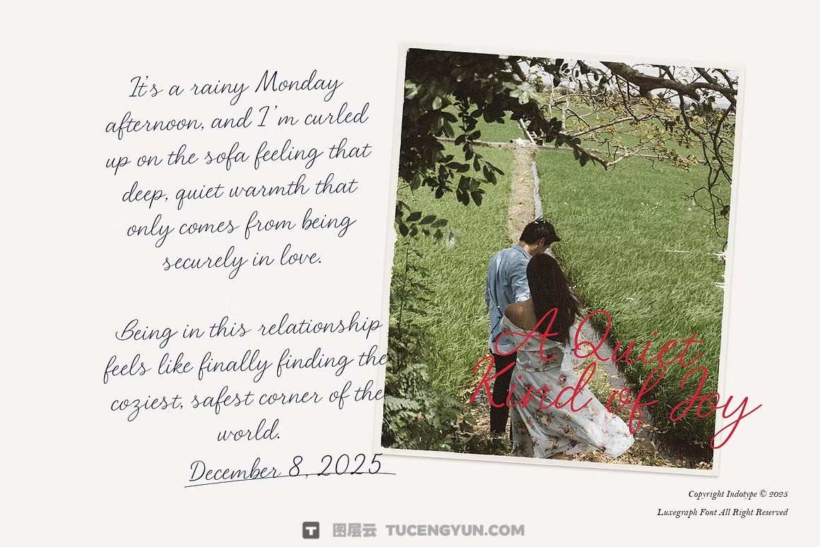 Luxegraph 是一款优雅流畅的手写字体,捕捉了个人签名的自然美感。设计中融合了自然的变化、优雅的连接和真实的笔触质感,仿佛笔触纸张的亲密触感,为任何设计增添了一丝人性的精致。这部现代剧本在休闲魅力与精致优雅之间取得了完美平衡,既显得个人化又极致。 Luxegraph非常适合重视真实性和人情味的品牌形象,提升了标志、产品包装、社交媒体语录、婚礼文具和个人项目的高度。其有机的流畅感和精心打造的字形确保了既精致又亲切、优雅又亲切的外观。用Luxegraph为您的作品带来标志性的风格——数字化的个性化艺术。