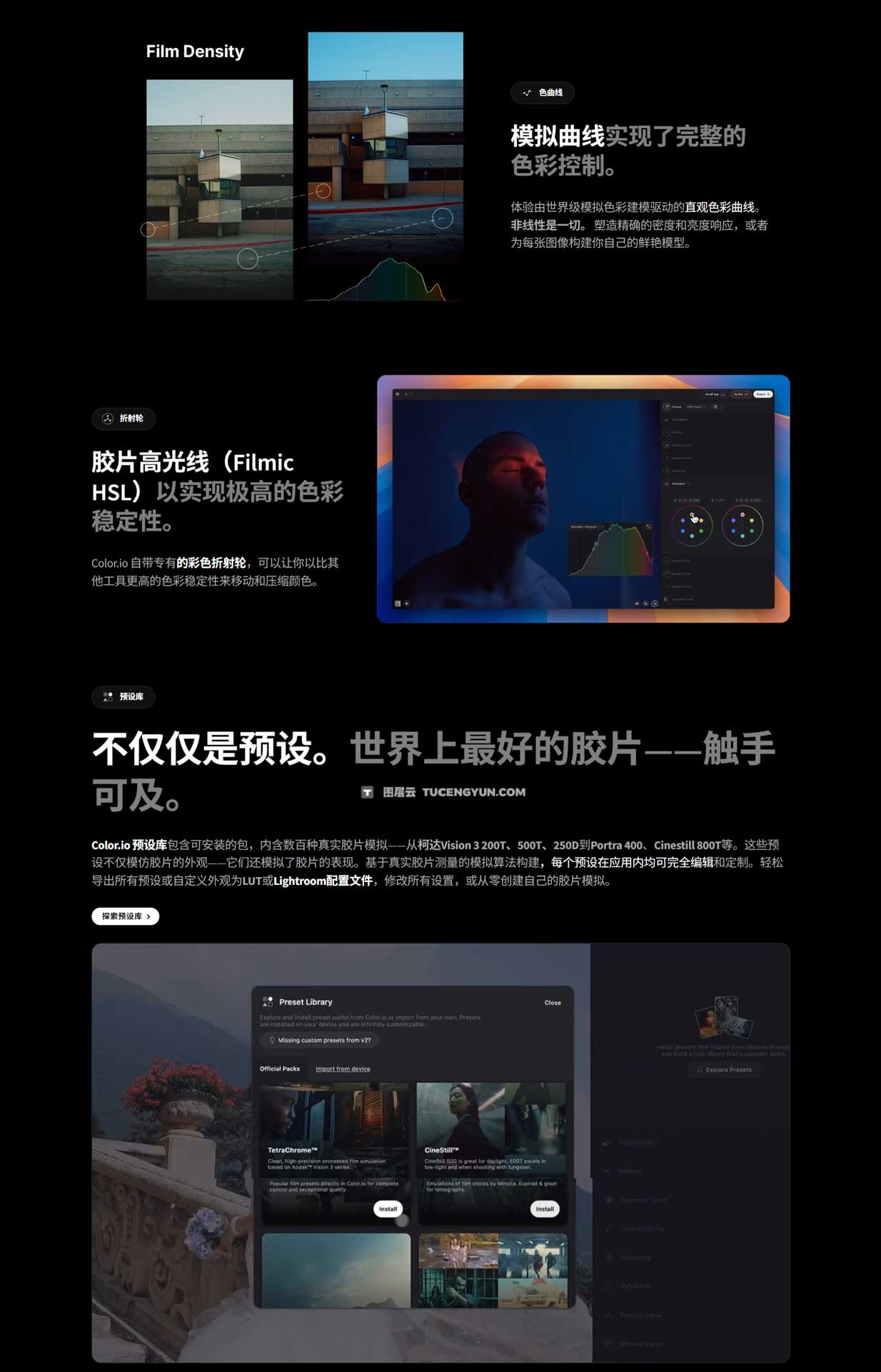 它利用胶片衍生的数学原理实现卓越的色彩稳定性和平滑度,使用户能够创建胶片般的色彩和纹理效果。该工具还包括真实颗粒功能,可使用 3D 体积胶片颗粒逐像素解构和重建图像。此外,Color.io 还提供真实胶片光晕模拟、色彩范围蒙版和用于高精度调整的压缩工具等功能。