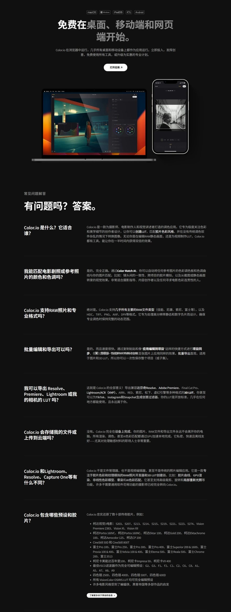 Color.io 是一个在线 RAW 图像处理器和一流的 3D LUT 创建器,帮助摄影师和电影制作人为他们的图像创造出惊艳的色彩。独一无二的色彩建模,模拟胶片的光响应。它嵌入了一个直观且易用的界面,旨在让你在一半时间内获得双倍的结果。