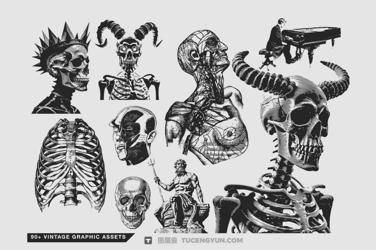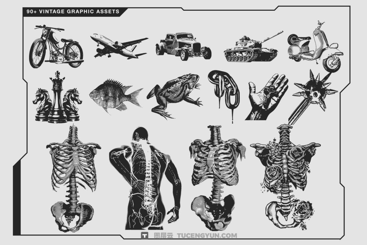 这些是带有多种主题的复古风格图形素材,例如:骨骼、复古物品、动物、载具和肖像,总共90+个资产。这些素材非常适合你的设计需求,比如插图和T恤设计。所以这当然对设计你的作品非常有帮助。