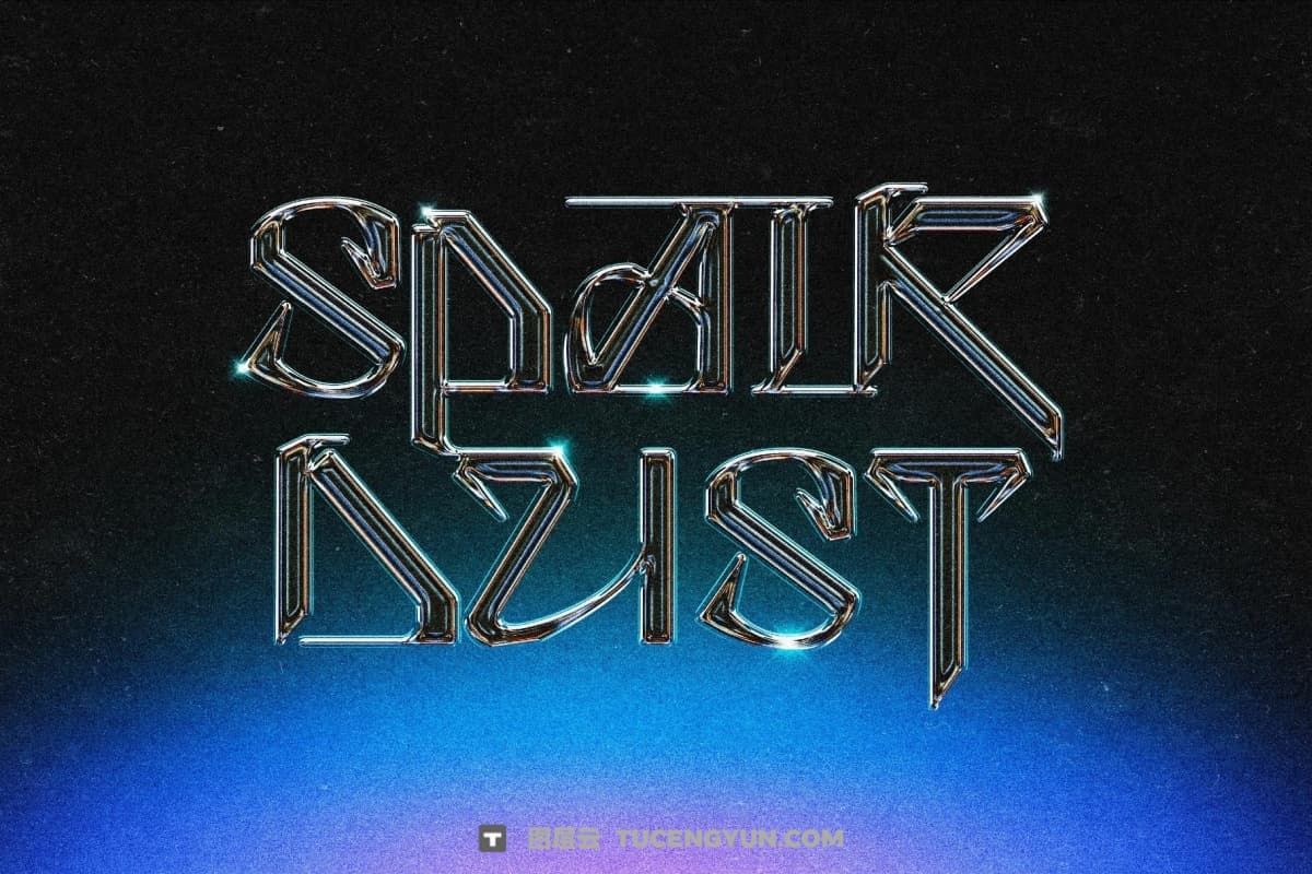 该效果模拟液态金属,呈现深黑色铬色调、锐利的高光和反光边缘,表现得像抛光油膜表面。形状雕塑般立体,光线沿着曲线和角落反射。这种风格非常适合专辑封面、时尚品牌、标志标记、游戏或科技视觉、海报以及富有表现力的符号。