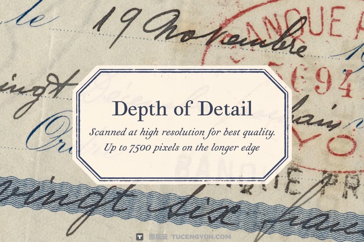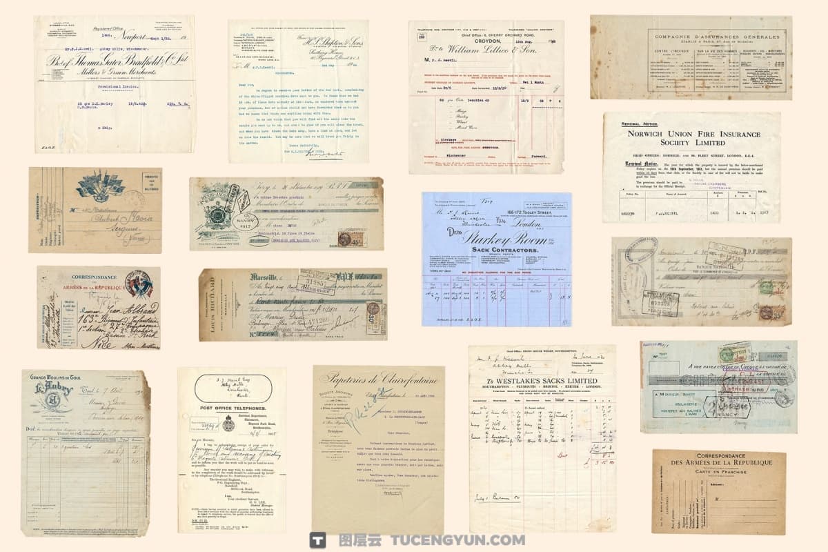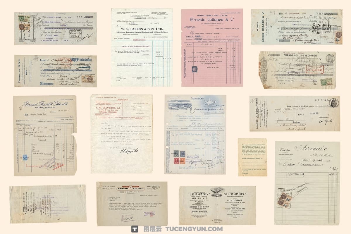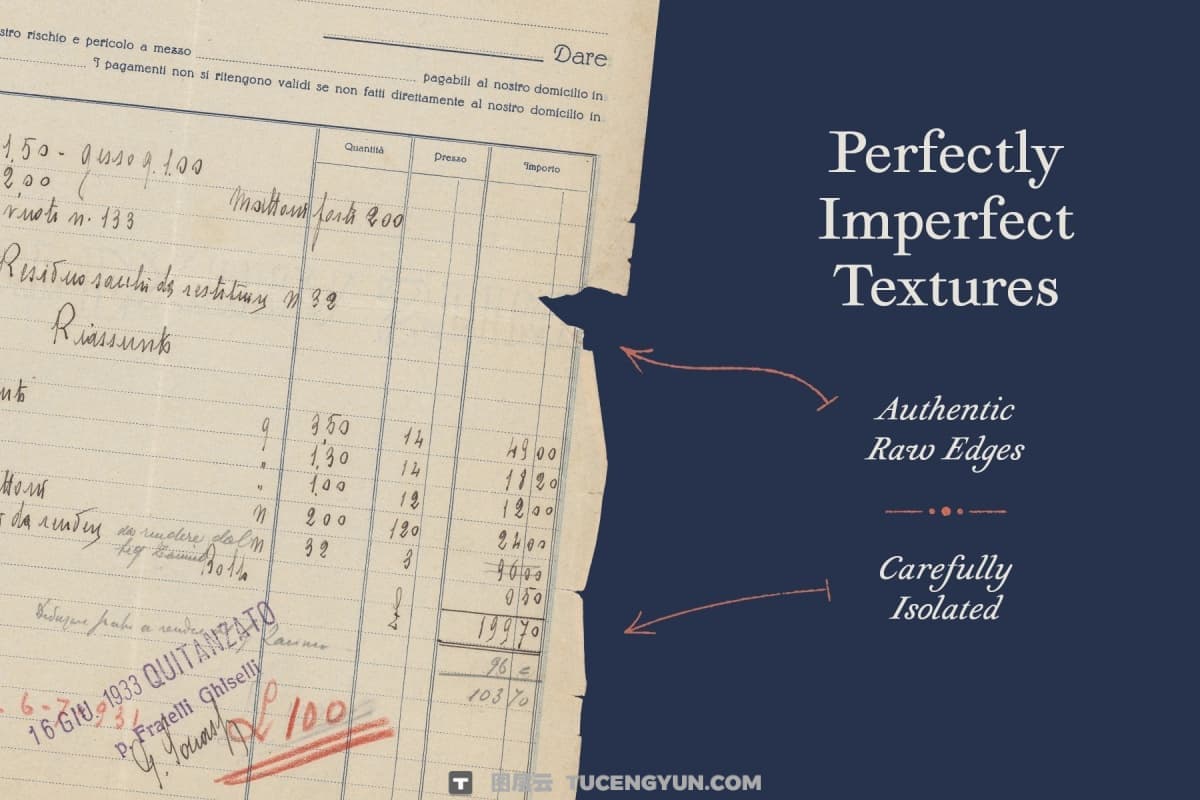 这套精心策划的真实复古文物收藏包含78种精美的陈旧纸质纹理,这些纸质质地均来自20世纪初 的原始文件。该收藏精心从意大利、英国和法国收集,包含各种印刷文物,如发票、收据、信头、表格、支票及其他古董文件。