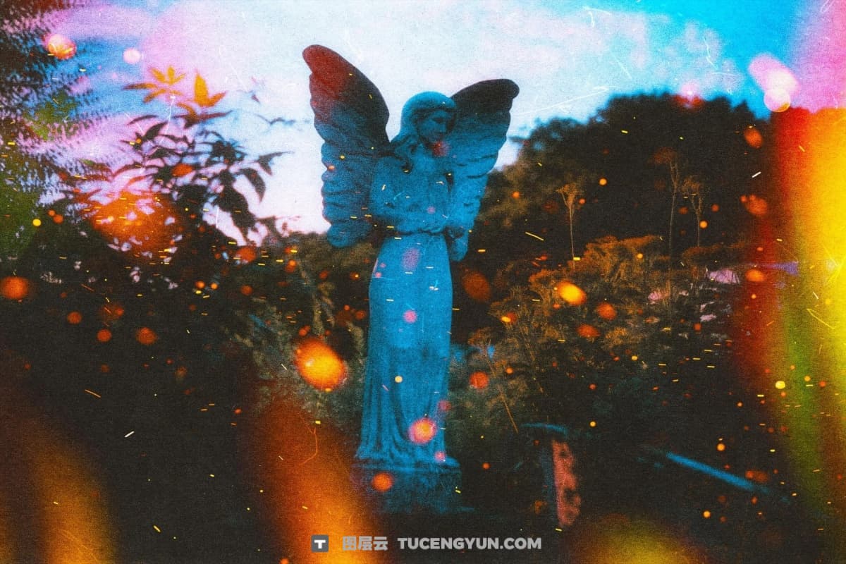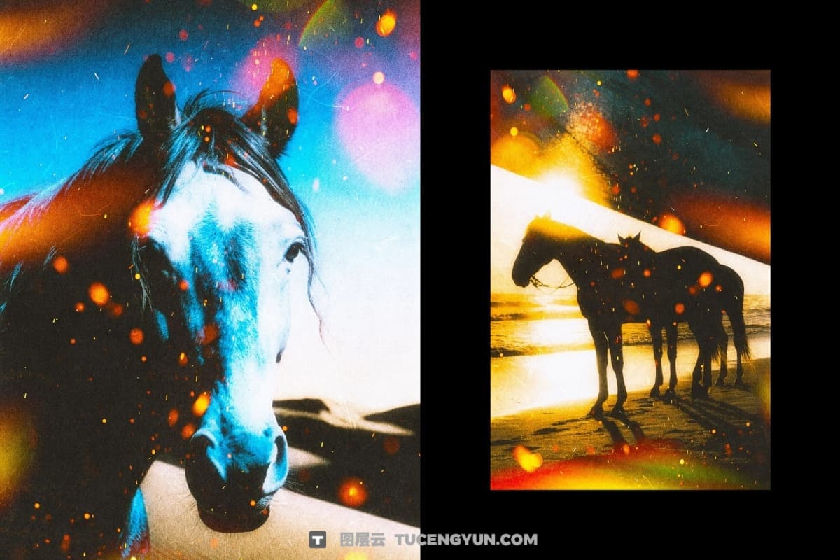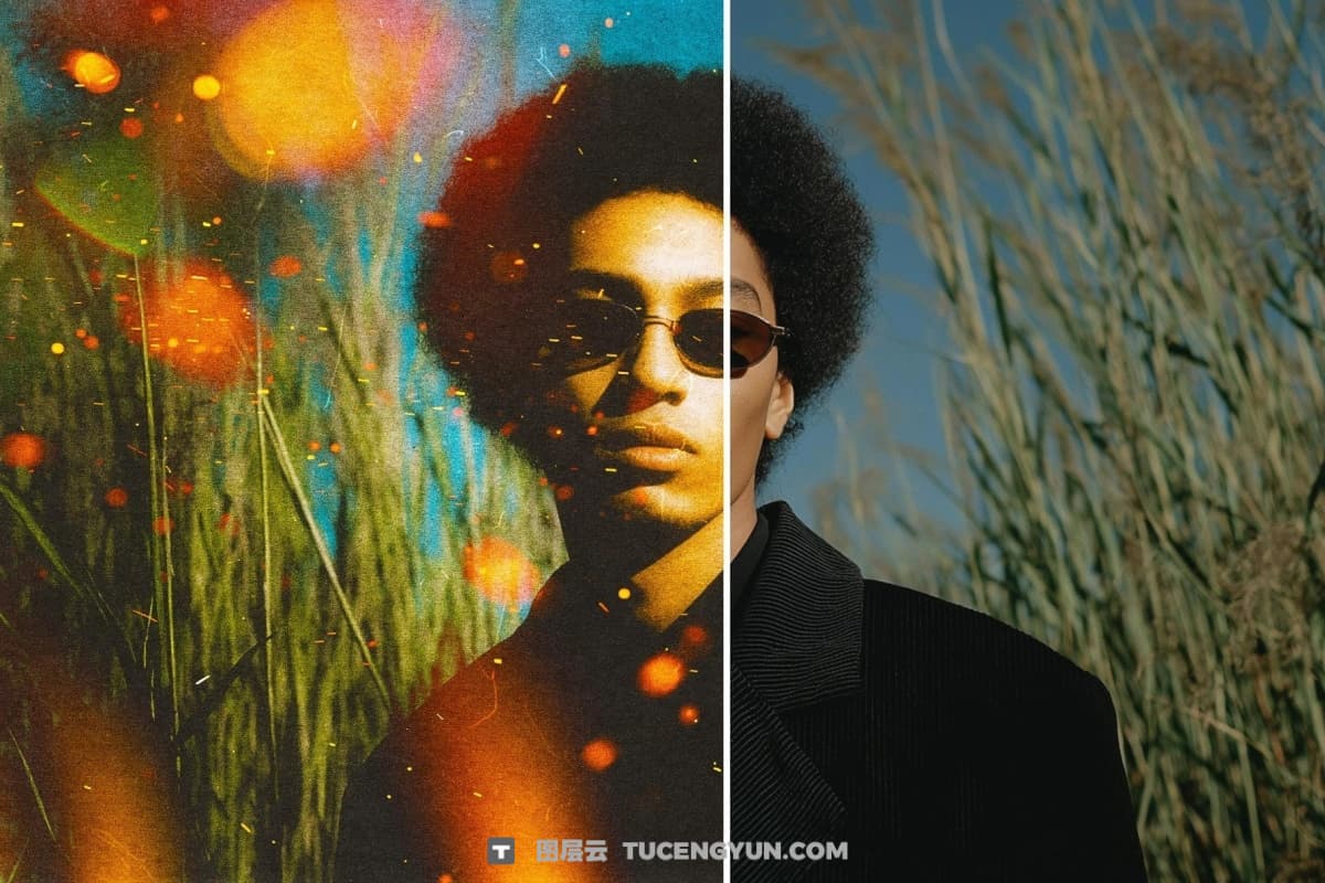 这种效果会让你的画面沾满琥珀色胶片的灼烧、零散的光晕和漂浮的尘埃点,就像傻瓜胶卷一样。光晕会推动高光前移,让色彩呈现出阳光浸润、朦胧的感觉。可以用它来制作单幅艺术作品、时尚时尚杂志、旅行日记、婚礼文具、艺术家发布图表或更具氛围感的网站页眉。