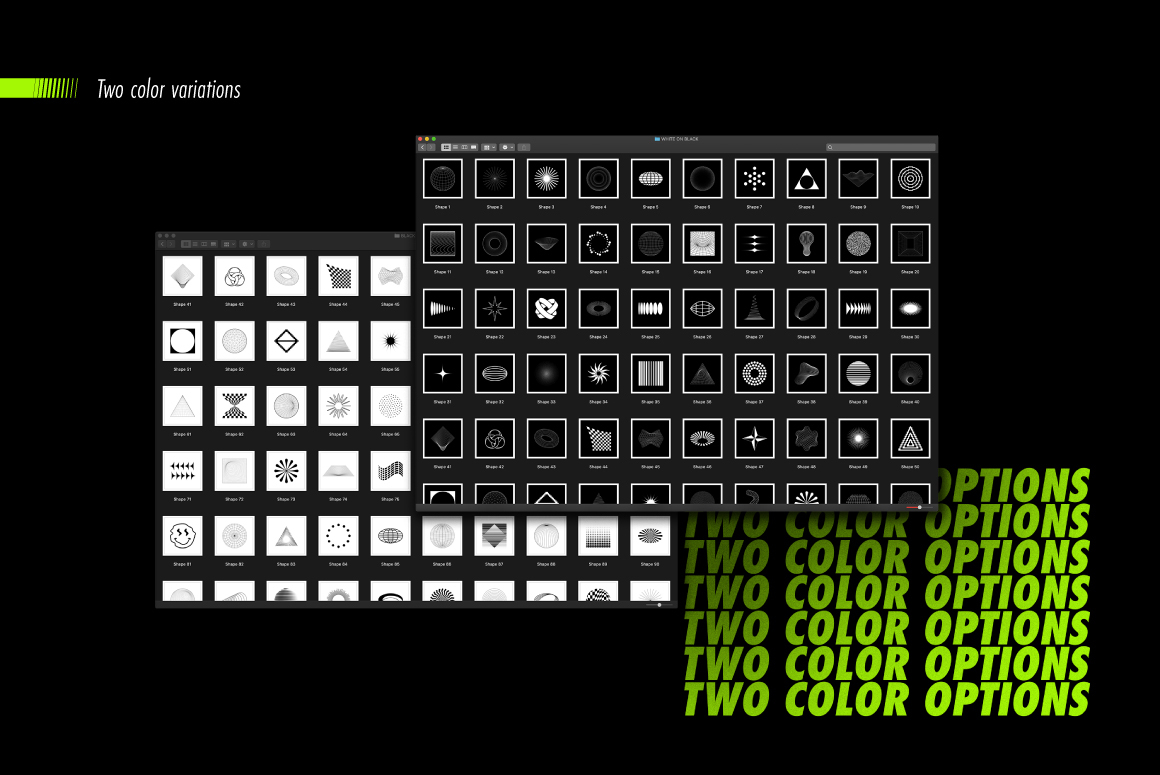 - 200个.PNG文件– 100种形状,两种颜色可供选择(高分辨率5000×5000px,透明背景)