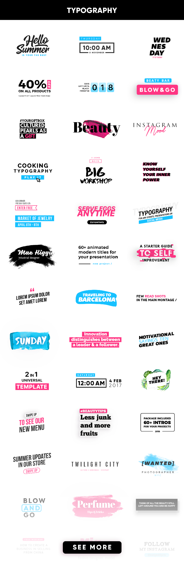 我们已经收集了一包时尚且绝对不同的动画小游戏,并将其分为15类,人们在Instagram中主要将它们用于广告,例如:基本,美容,商业,轮播,教育,销售,体育,踩踏,旅行,视频模板,过渡效果,背景,动画版式,动力学和全息模板。
