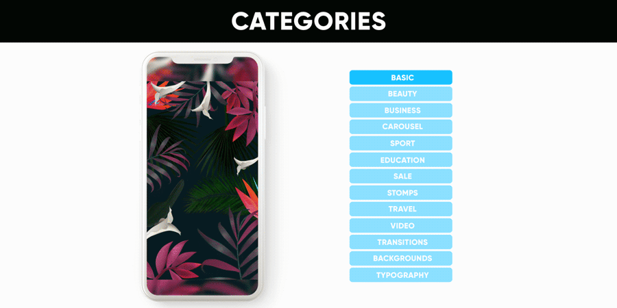 您要做的就是添加照片或视频,更改文本并以所需的格式保存。此外,除了模板之外,我们还为insta故事添加了52个特殊的图形元素,例如箭头,手,下三分之一等。