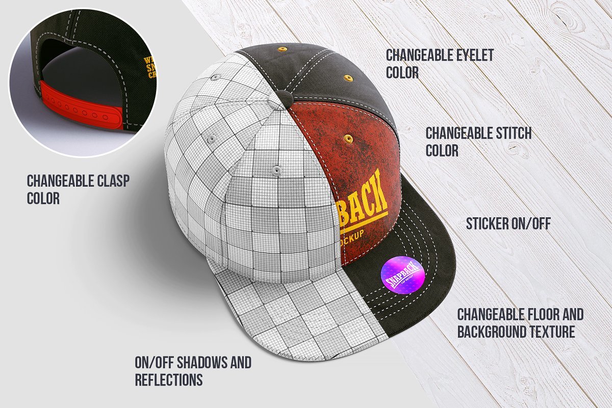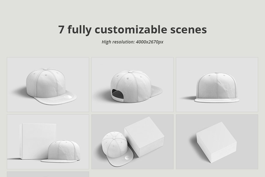 这款带有Snapshot贴纸的高品质Snapback帽子3D实体模型可为您的设计创建优雅的演示文稿。所有场景都包括3d图层,智能对象和蒙版,可让您轻松添加设计并更改大多数场景对象的颜色。