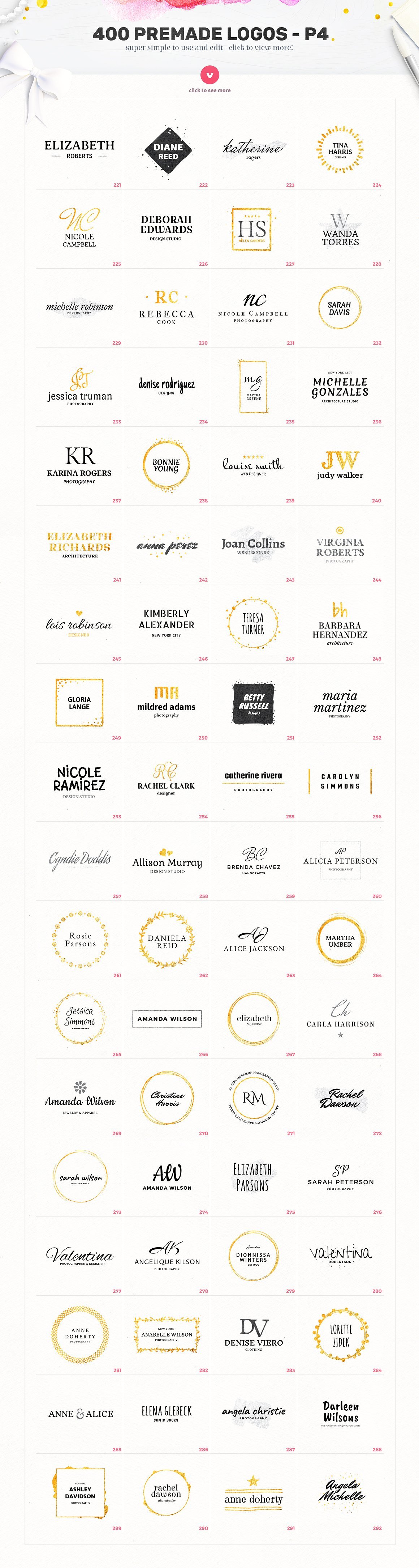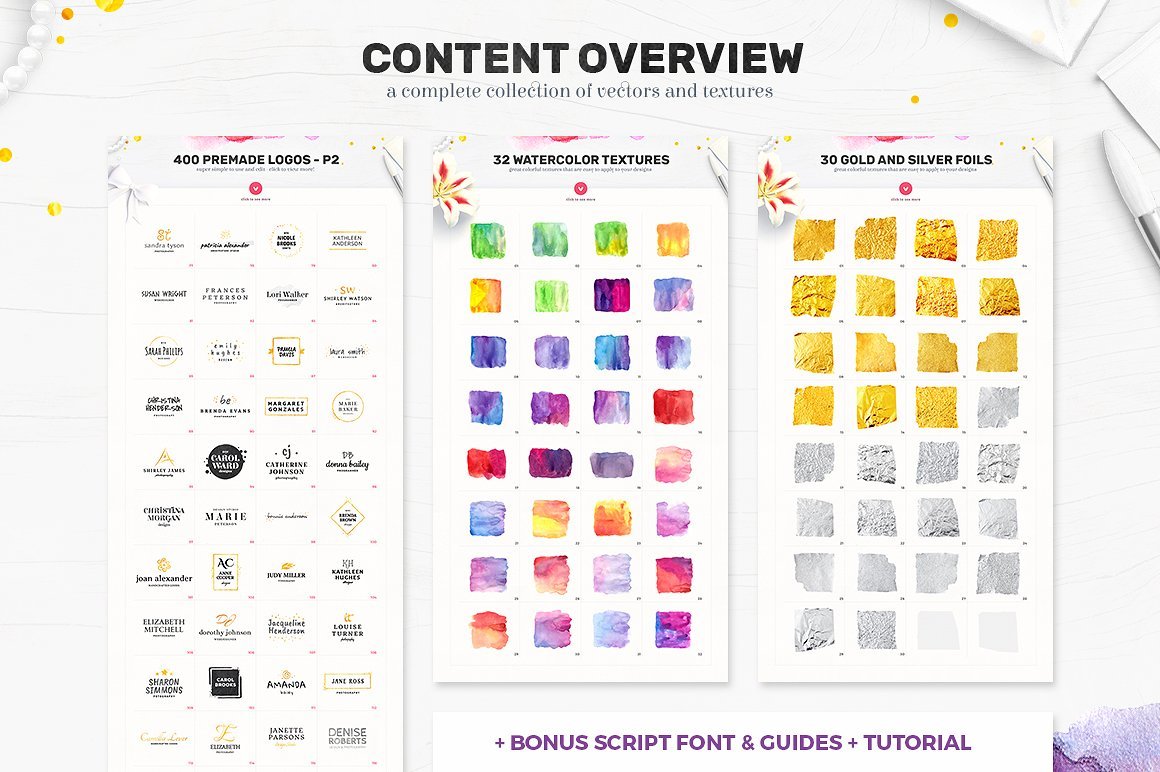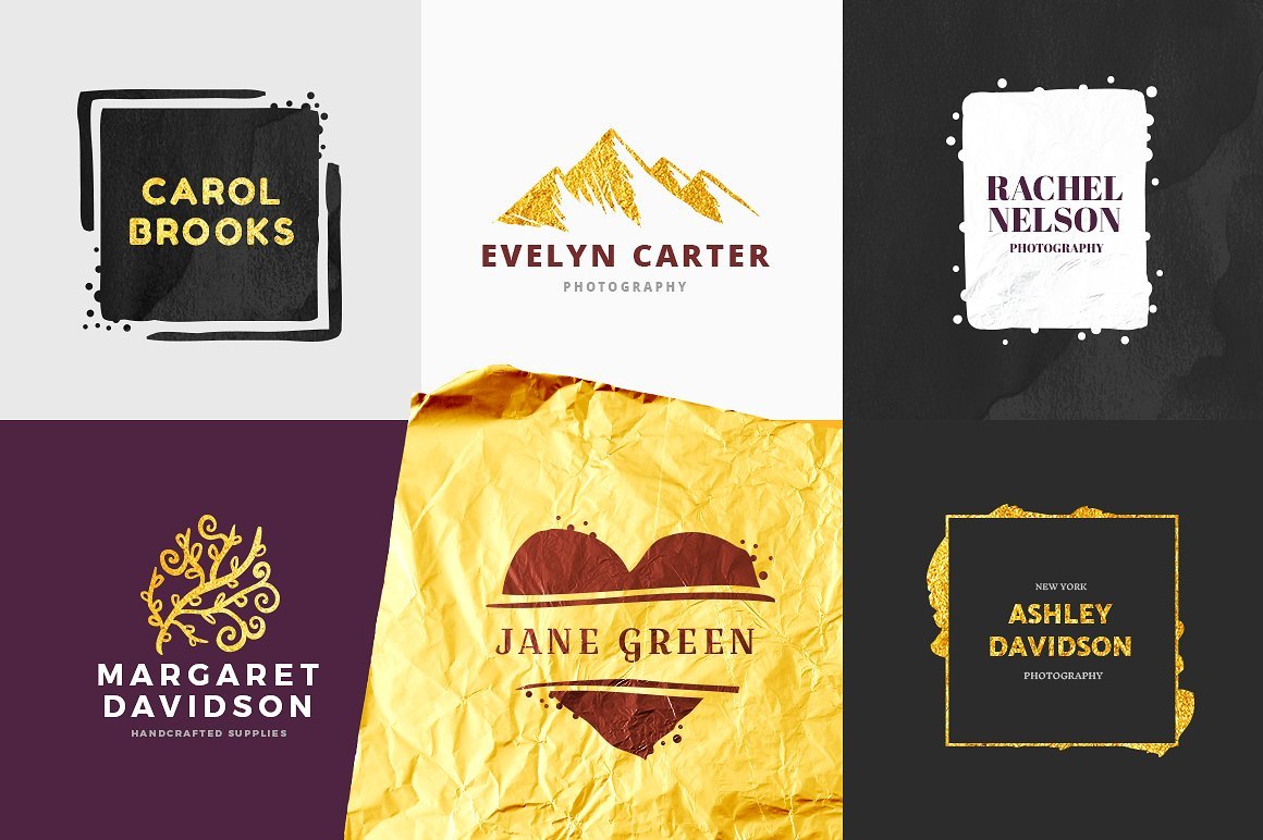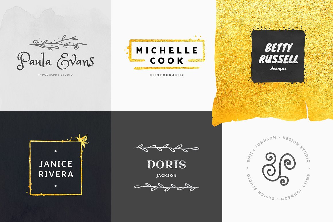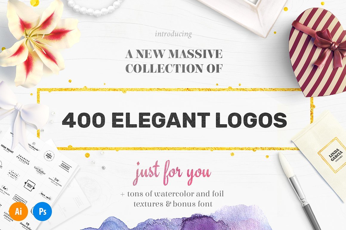 这个素材包整理了400枚拿到即用的 Logo,32个水彩纹理和30个金色、银色的文本效果。