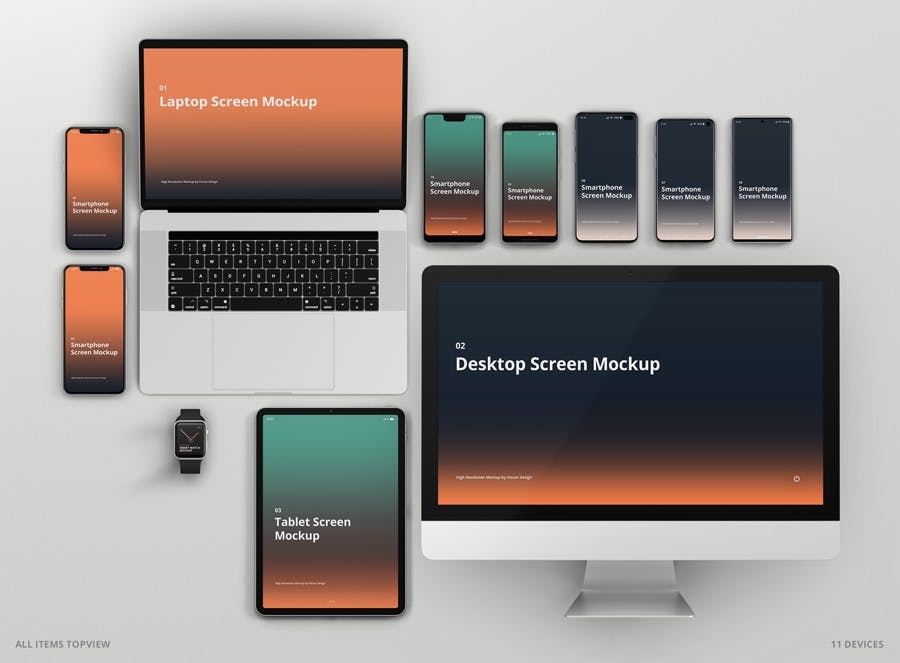 借助随附的预制PSD场景和11种不同的设备在顶视图和侧视图中立即显示您的网站、界面或UI设计。非常适合于响应式设计以及在不同设备上进行测试的目的。易于使用且可完全自定义,如可移动项、设备颜色、单色等(所有功能列在下面)。将其用于Instagram之类的社交媒体帖子,以增加网站或Behance项目上的投资组合的趣味性。由于其高分辨率,也可用于打印目的。可用性是无止境的。