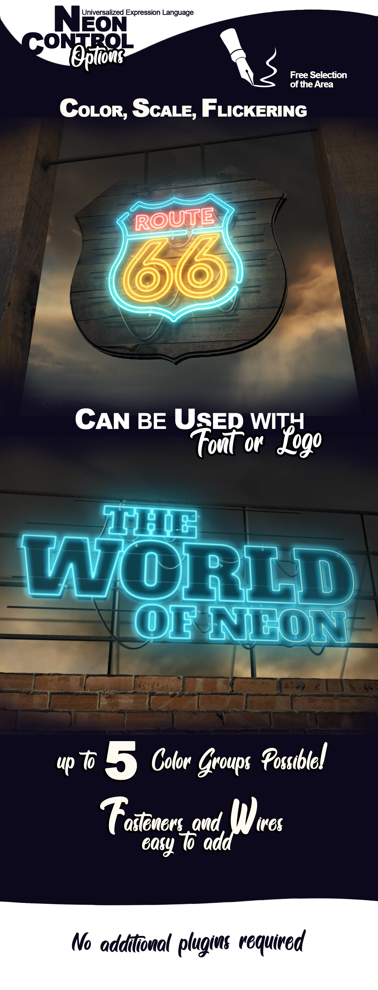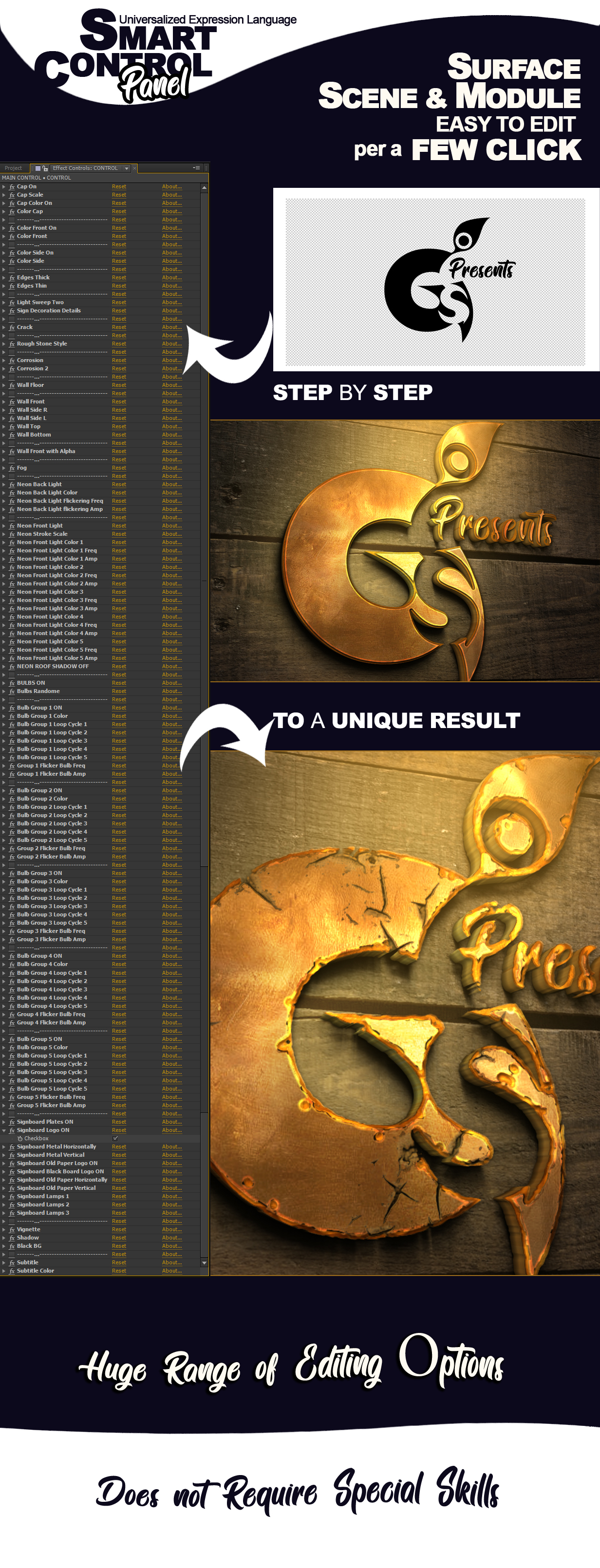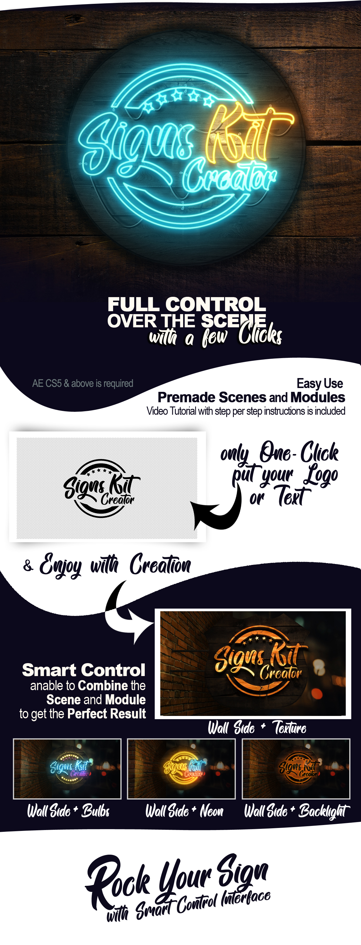 Signs Kit Creator – After Effects项目–与文本和徽标一起使用。视频模板提供了大量制作单个徽标动画的可能性。它包括霓虹灯,跑马灯灯泡,背光方式以及许多创建徽标独特表面的选项。专业设计的标志,为您的业务,工作室,咖啡馆,书,游戏或特殊事件。