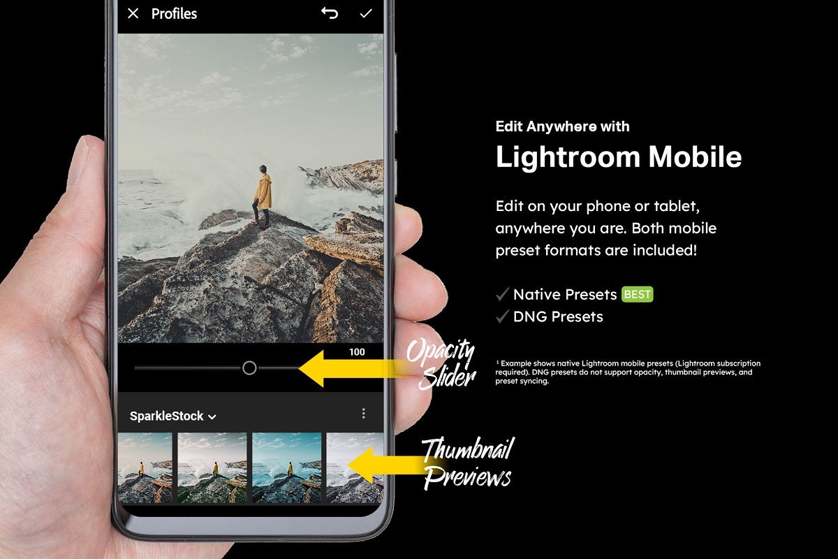 通过手机拍摄,编辑和发布所有内容!您将获得两种类型的Lightroom Mobile预设。通过免费的Lightroom Mobile应用程序使用DNG预设。如果您拥有付费版本,请使用本机移动预设来解锁不透明度支持。