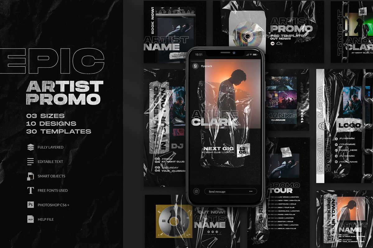 这些Photoshop模板是专门为艺人设计的,他们试图以专业的艺术魅力散发艺术作品,吸引每个休闲观众。三种尺寸的10种不同设计,可让您通过自我促销发挥创意,并为您带来新的营销工具,吸引您的注意力!吸引新的粉丝,潜在客户和客户。