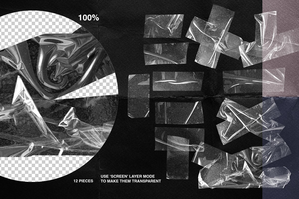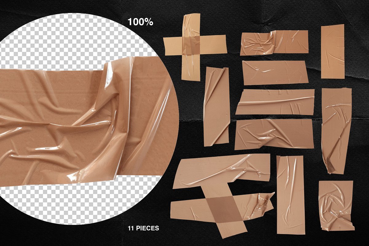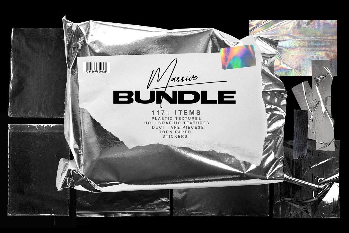 最时尚的物品的绝妙收藏:保鲜膜纹理,胶带块,撕碎的纸张,贴纸,全息纹理和徽标。这就是您的品牌脱颖而出所需要的!