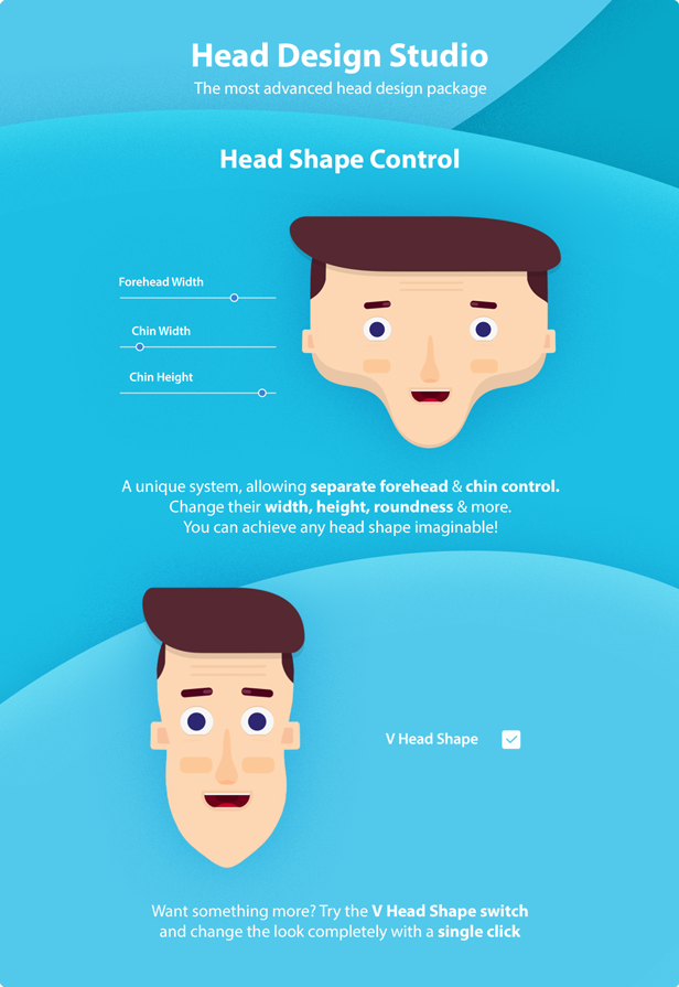 一个独特的系统,让您控制额头和下巴 分别。控制其宽度,高度,圆度等。您可以实现任何可以想象的头部形状!