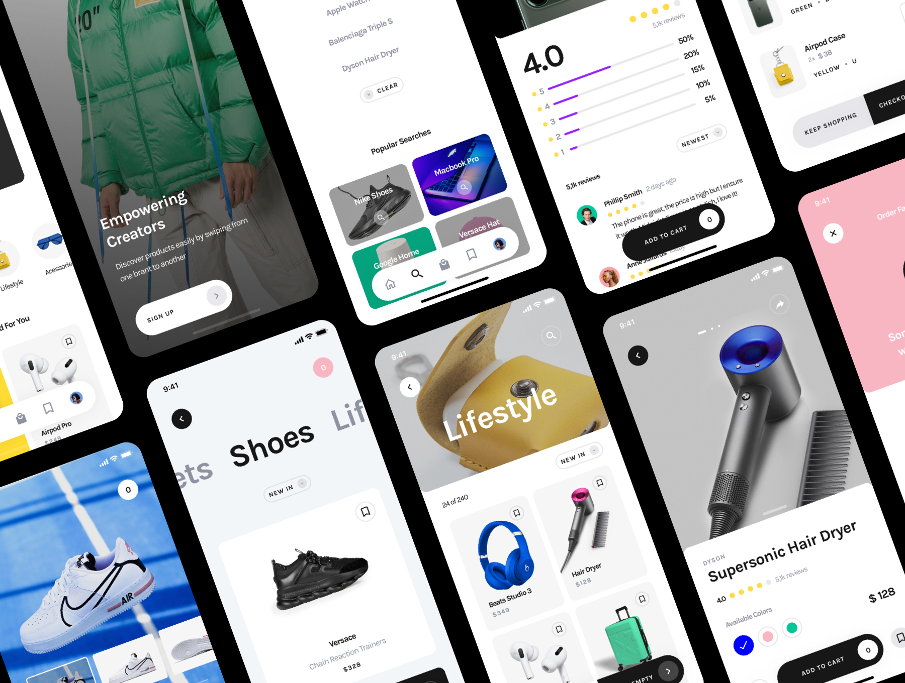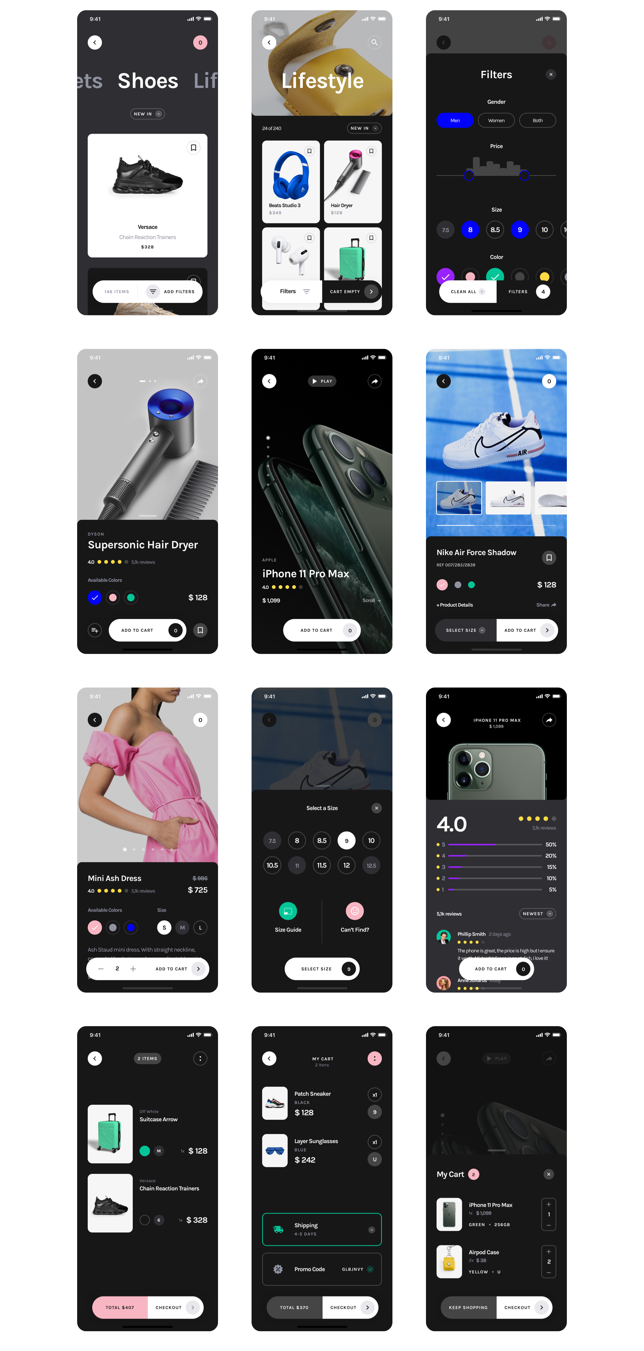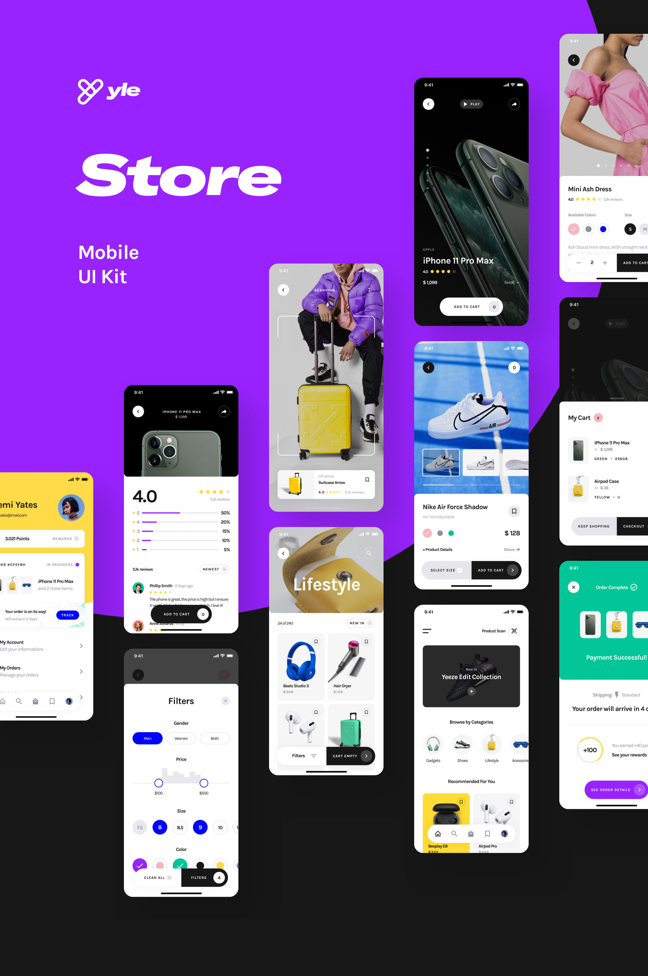 Yle Store包括入职屏幕,登录,注册,密码恢复,电话验证,产品类别,多个产品页面,收藏夹,过滤器和搜索,运输信息,付款明细和卡,结帐,成功和失败消息,迷你购物车,评论等…