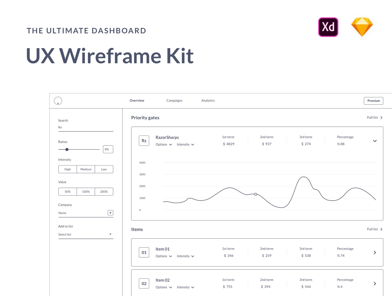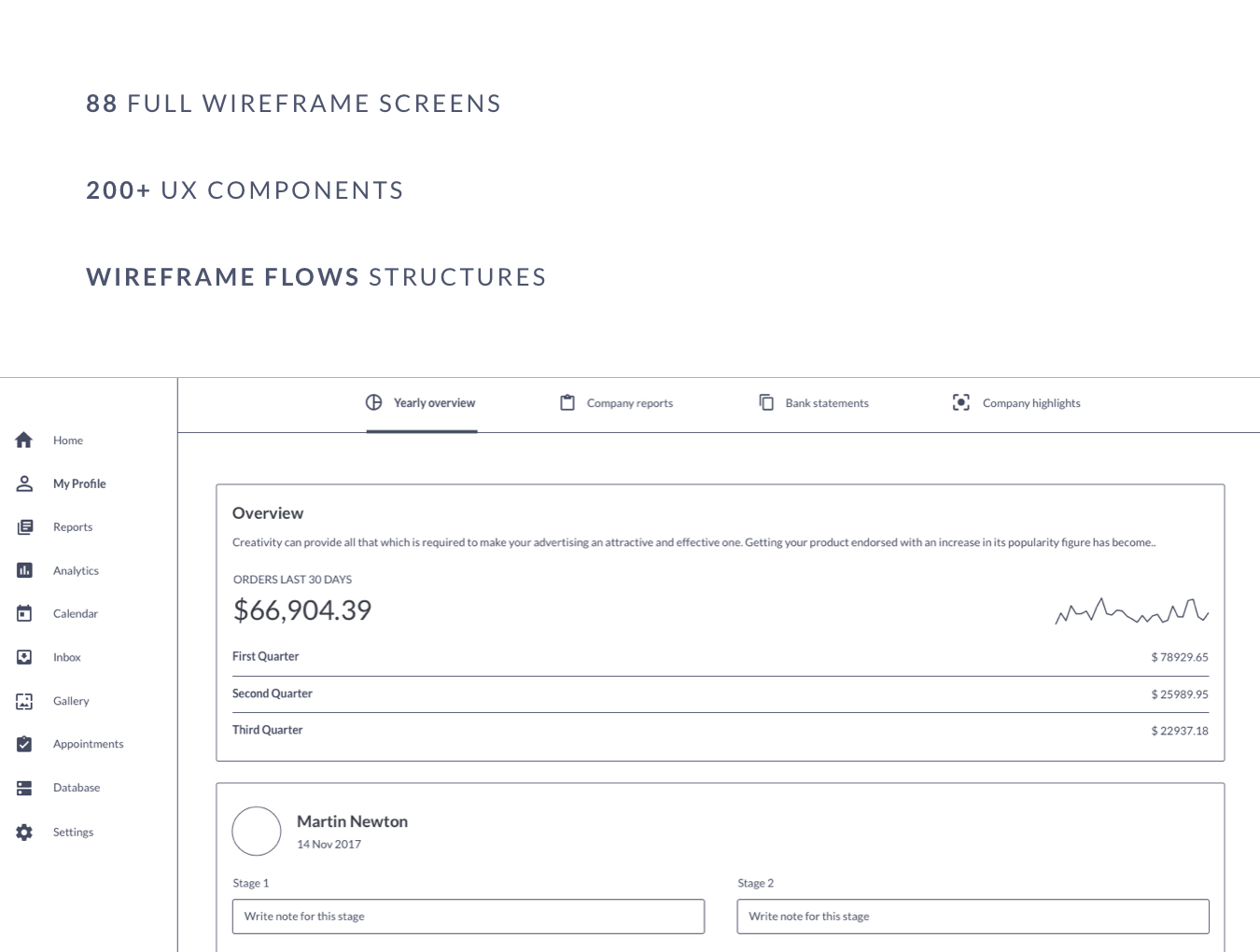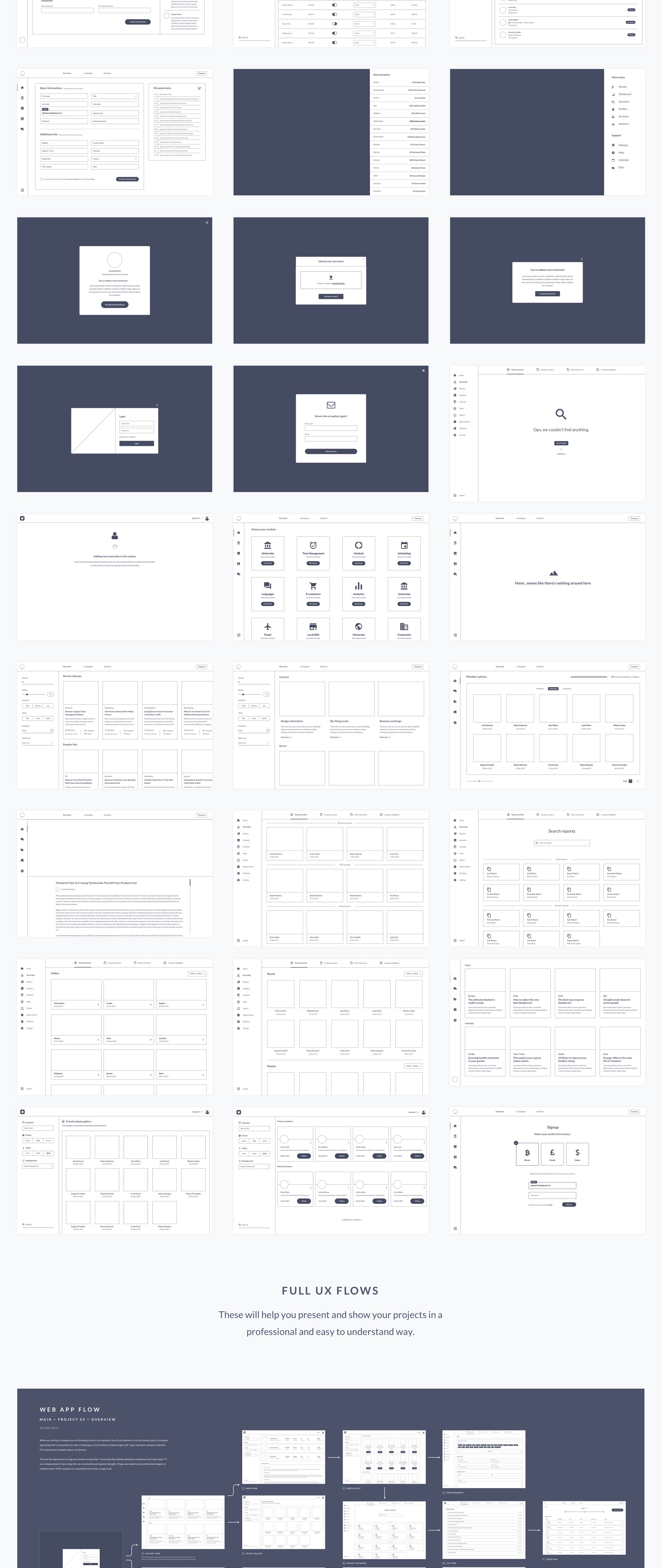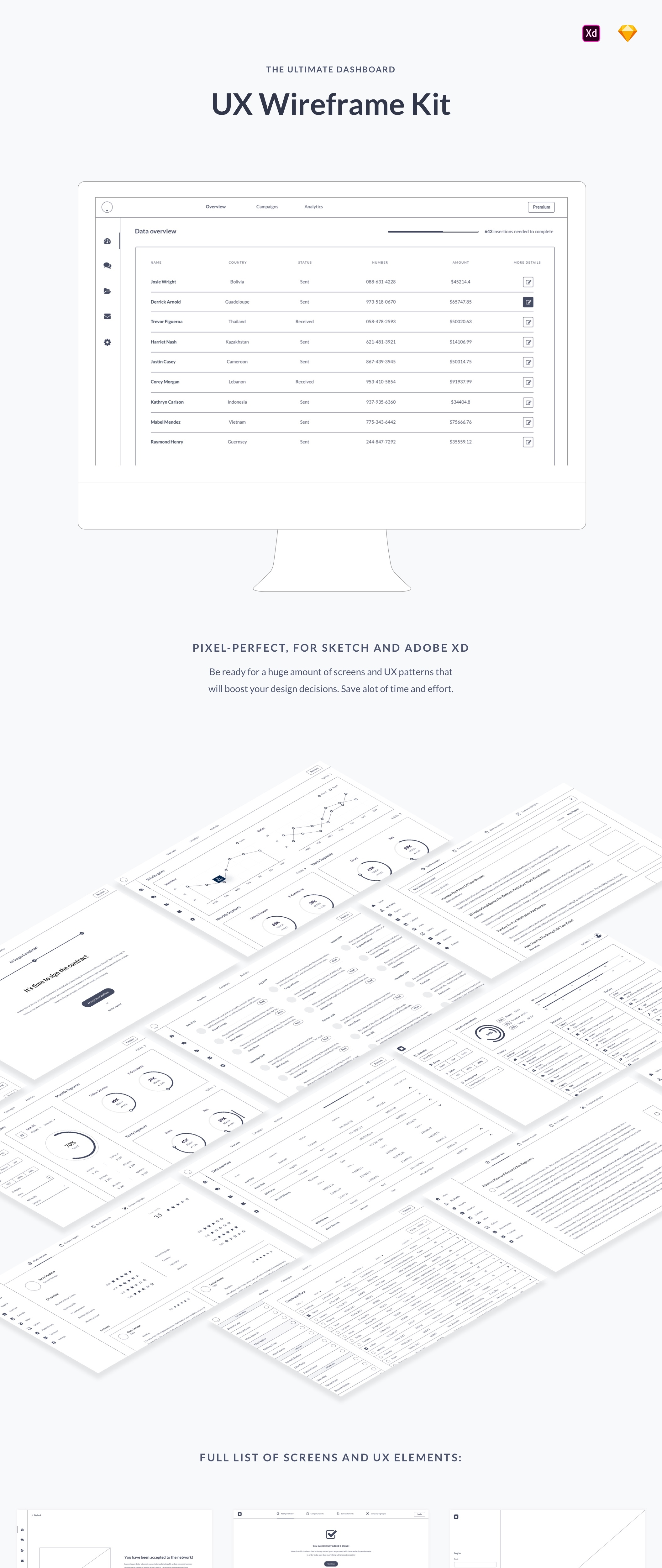 完整的线框屏幕,UX元素和演示流程的大量集合。Ultimate Dashboard UX线框套件是启动新的Web应用程序项目所需的唯一工具,并且可以为您的项目节省数百小时的时间。这些屏幕和元素将帮助您立即为客户设计漂亮的界面。Sketch和Adobe XD文件是Lato附带的,Lato是Google免费网络字体。