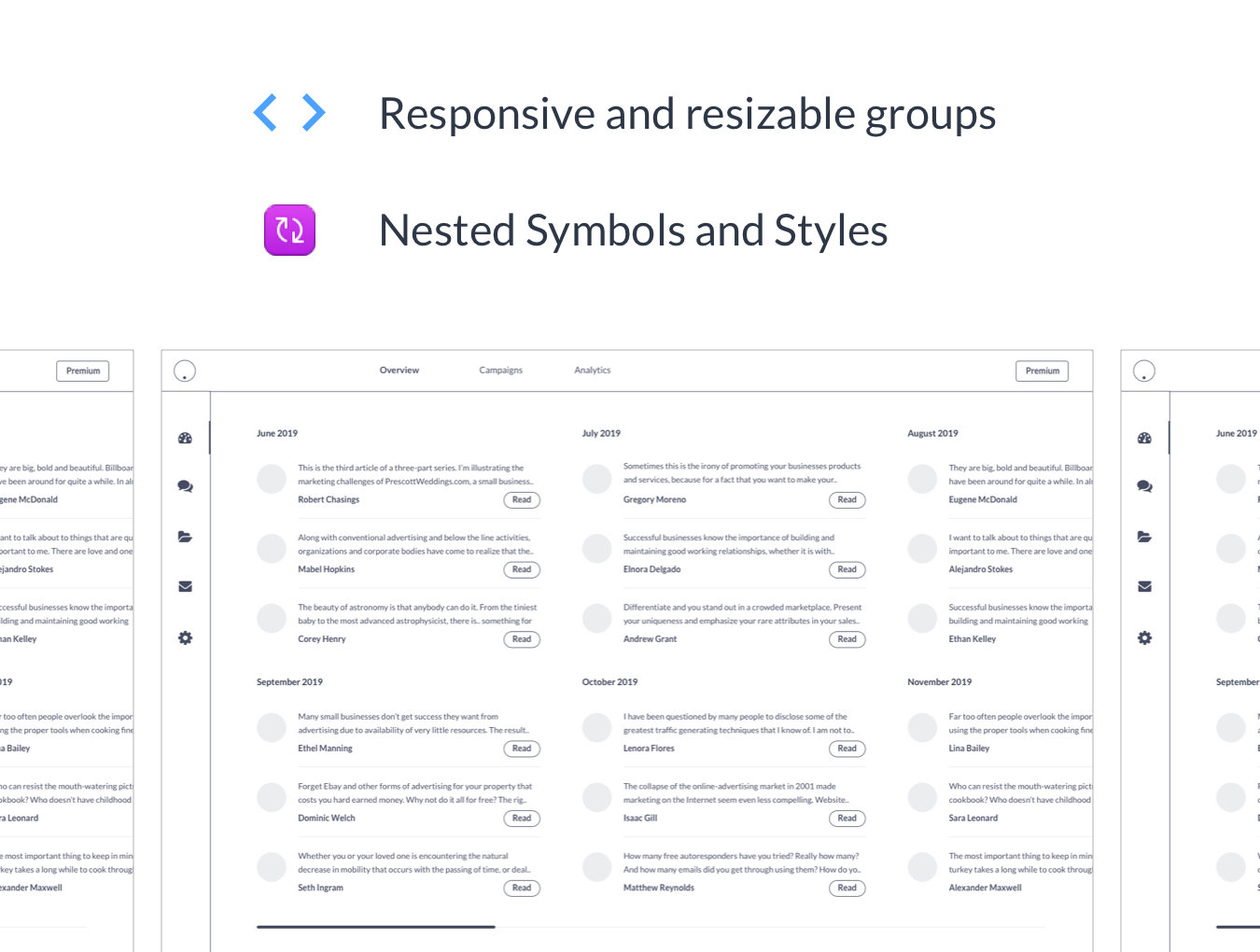 该工具包包括符号和图层样式,因此您只需单击几下就可以轻松更改整个UX工具包的版式和某些组件!大多数组件和组还具有响应性和可调整大小,因此您可以快速轻松地将这些屏幕调整为自己的自定义画板。