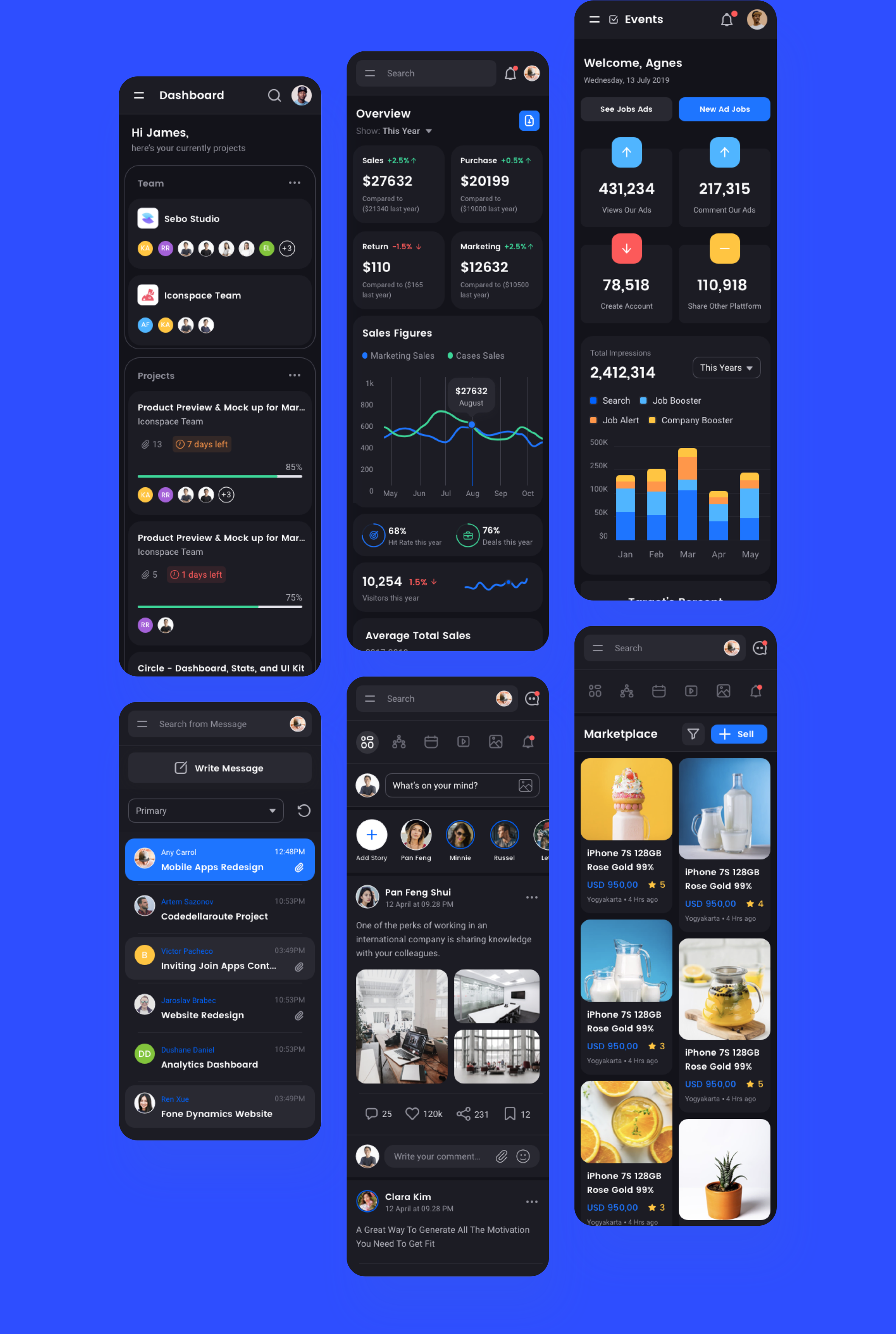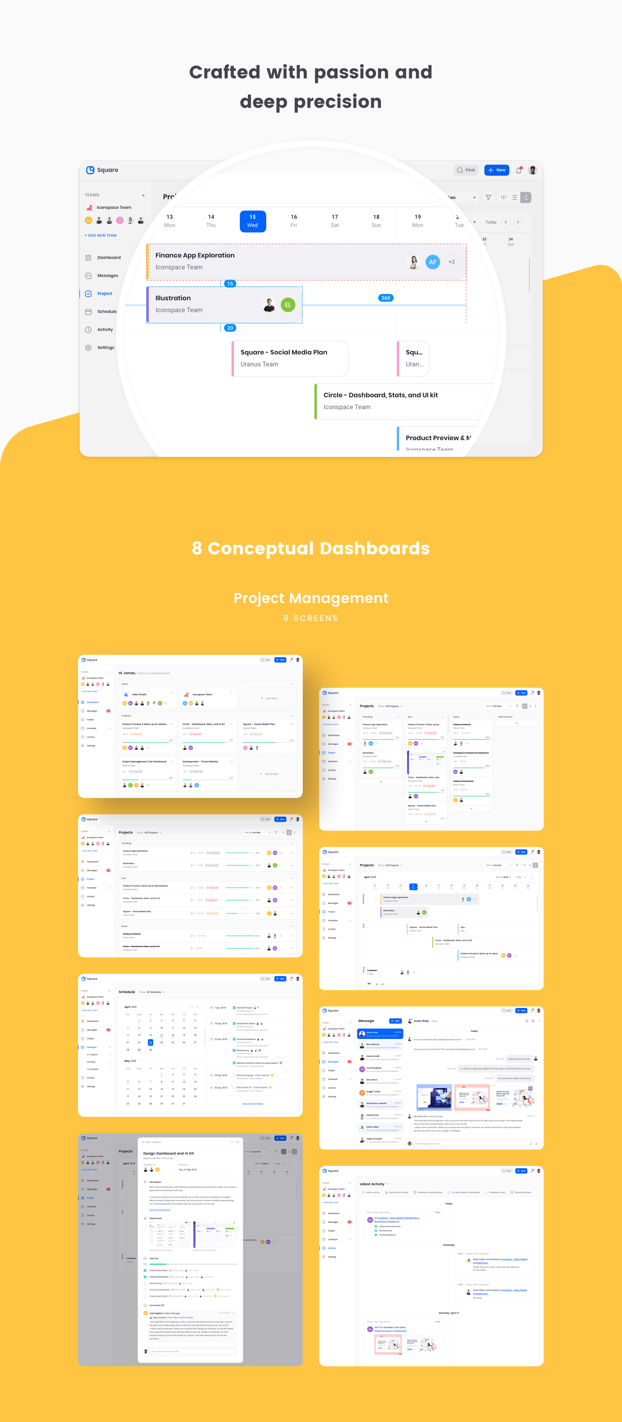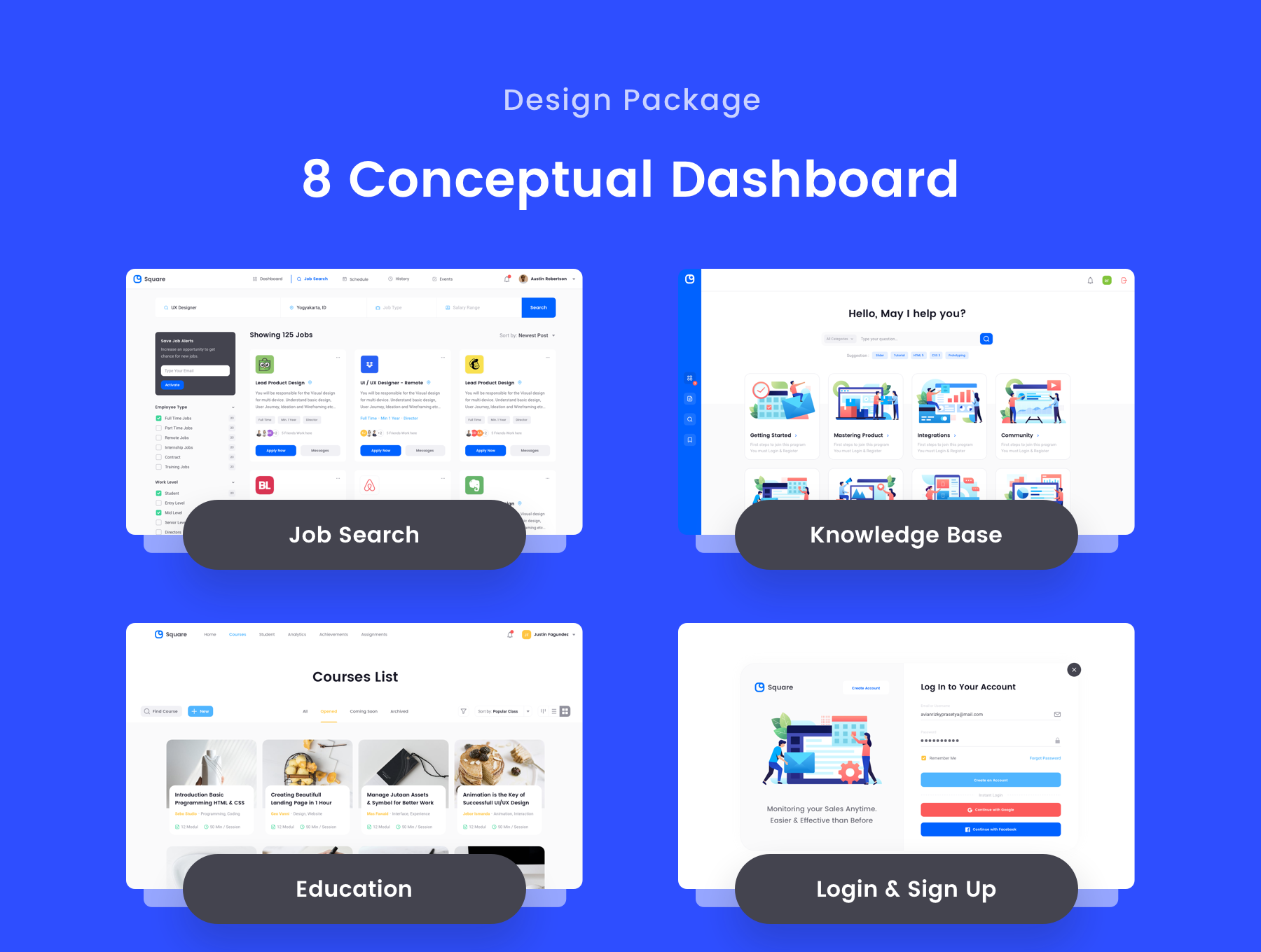 Square Dashboard UI工具包该套件仪表板充满激情和精确度,可根据您的产品需求提供非常完善的功能。可用于满足项目管理,消息传递平台,社交媒体分析,销售分析,职位搜索,知识库,教育和注册/登录表单需求的各种元素。采用圆角形状和现代配色方案制成的独特风格。使它看起来充满活力,并与当前和将来的设计风格相匹配。