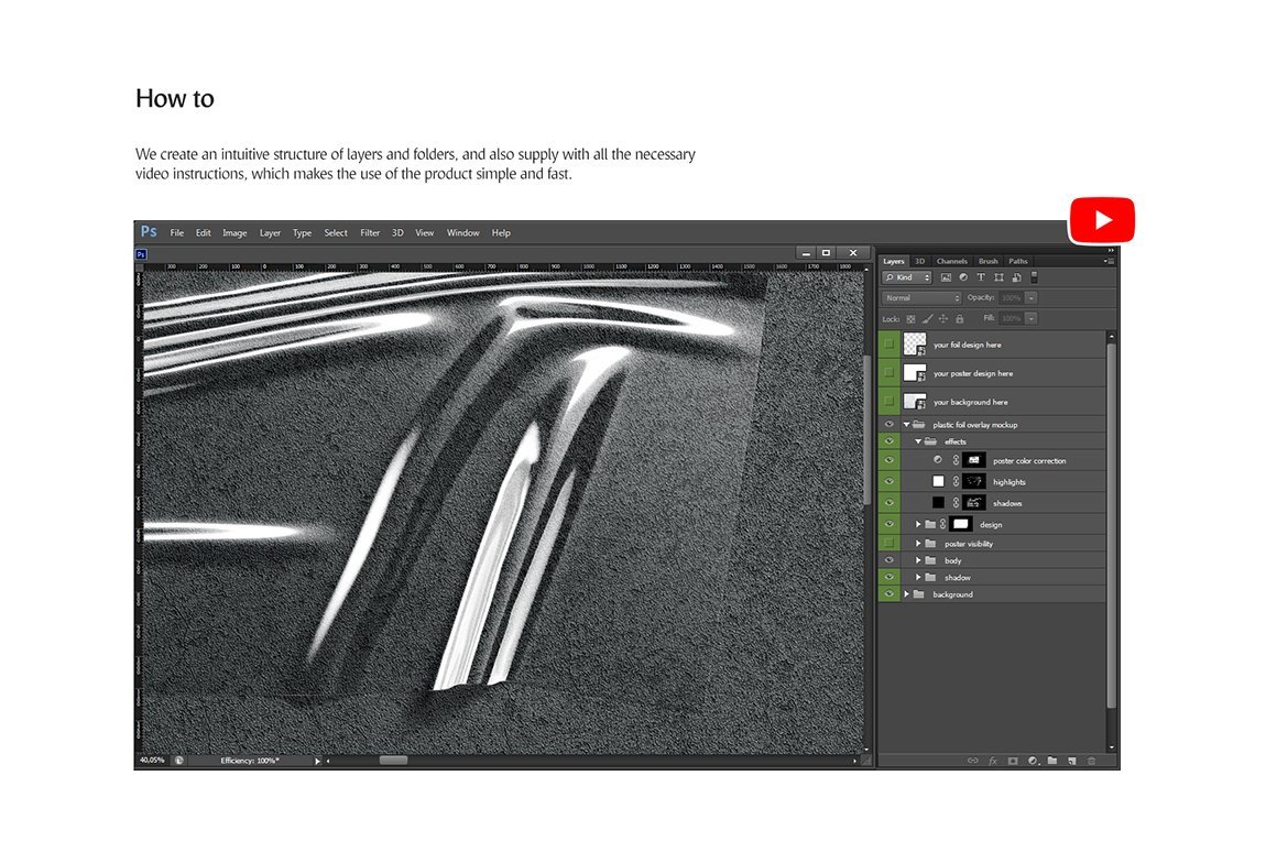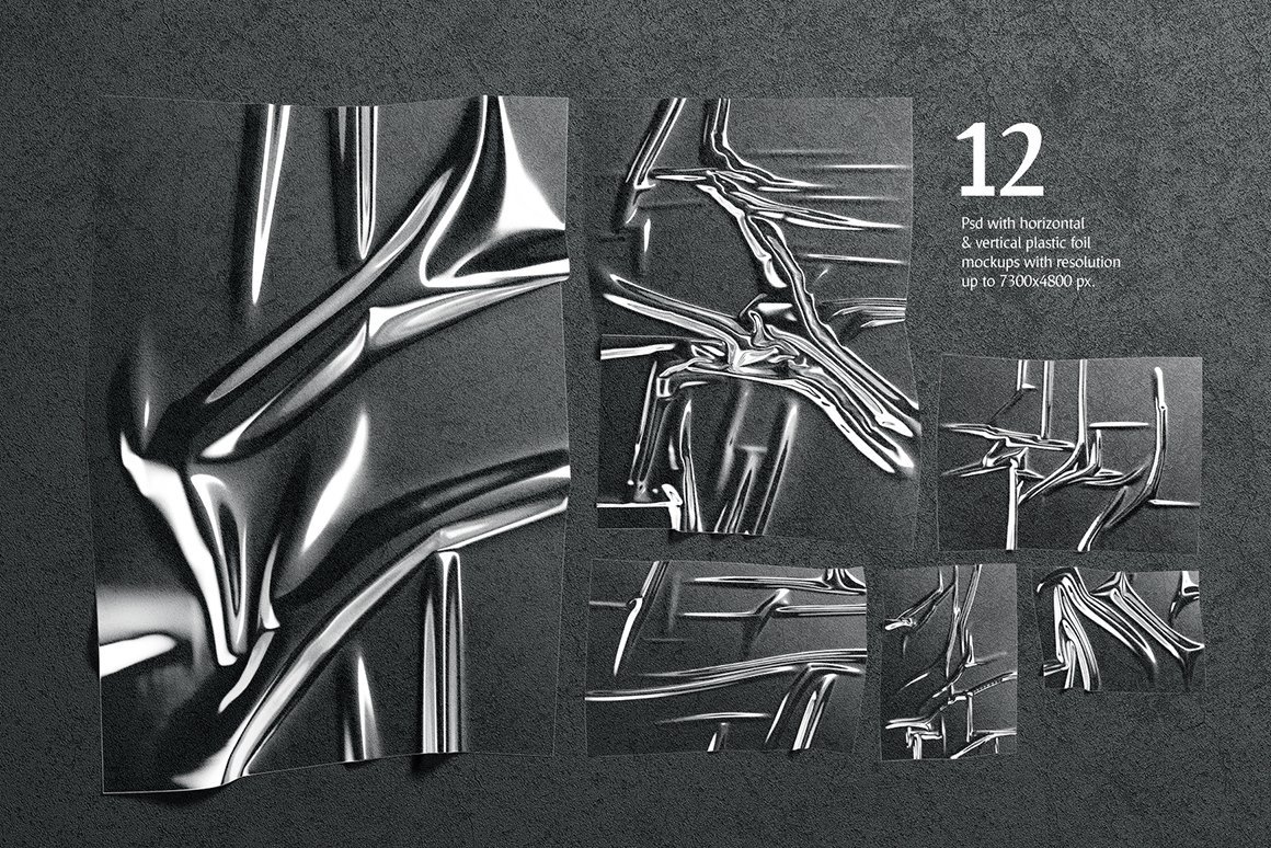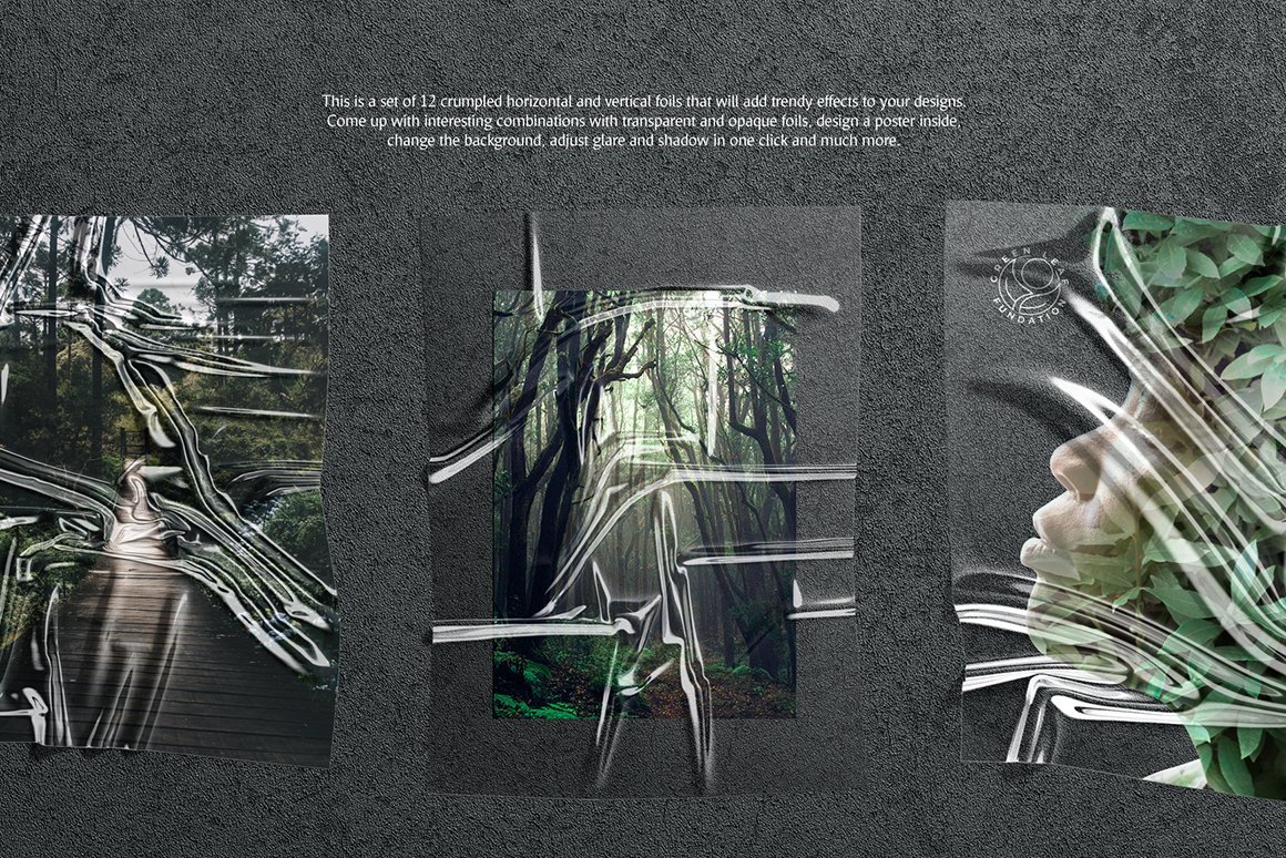 12种水平和垂直皱纹箔,可为您的设计增添时尚气息。只需将透明和不透明的箔纸进行有趣的组合,即可在内部设计海报,更改背景,只需一次单击即可调整眩光和阴影等等。