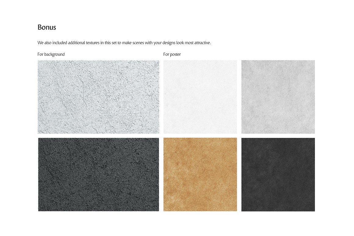 奖金-2个墙背景和4个纸张纹理使您的设计场景看起来最有吸引力。
