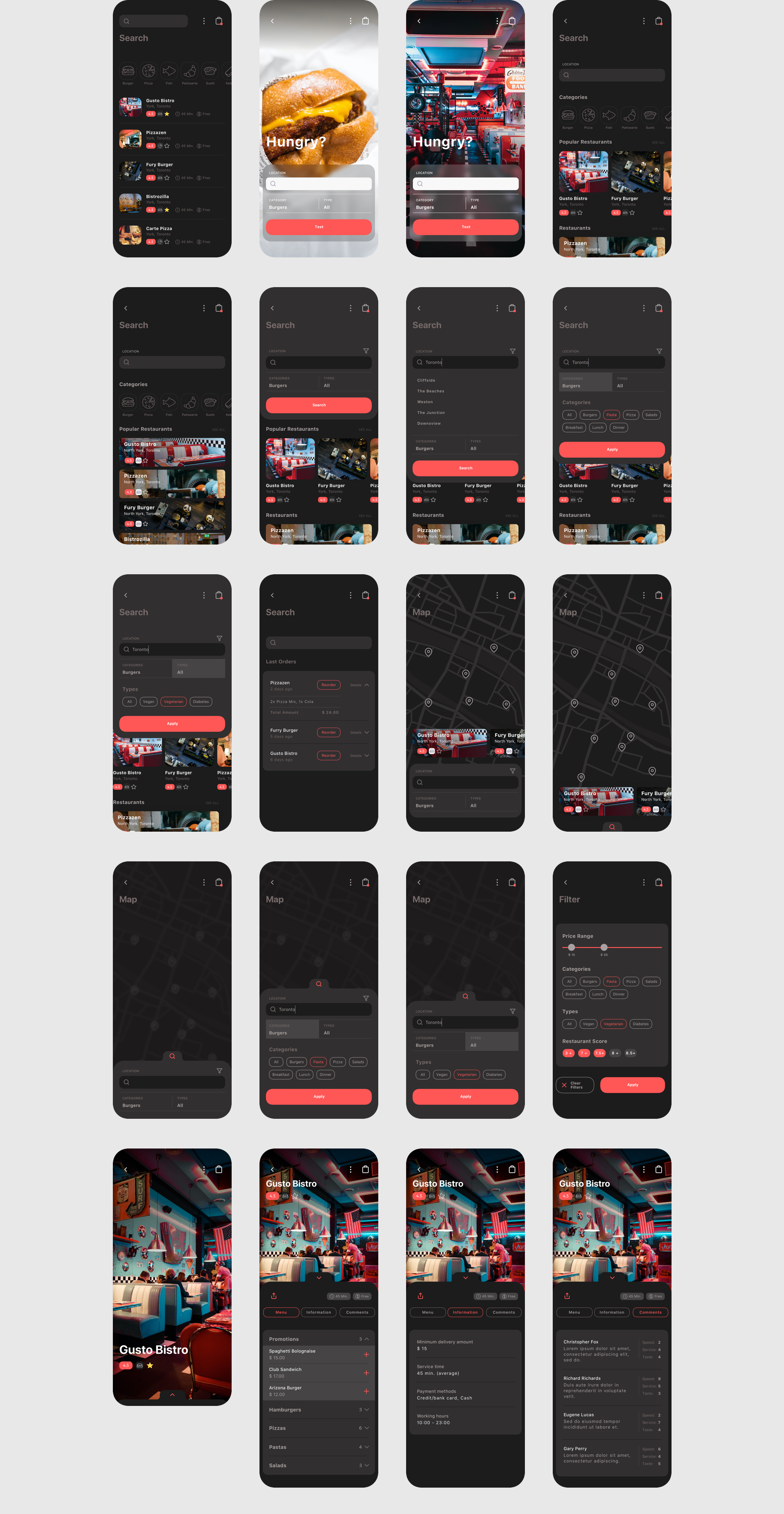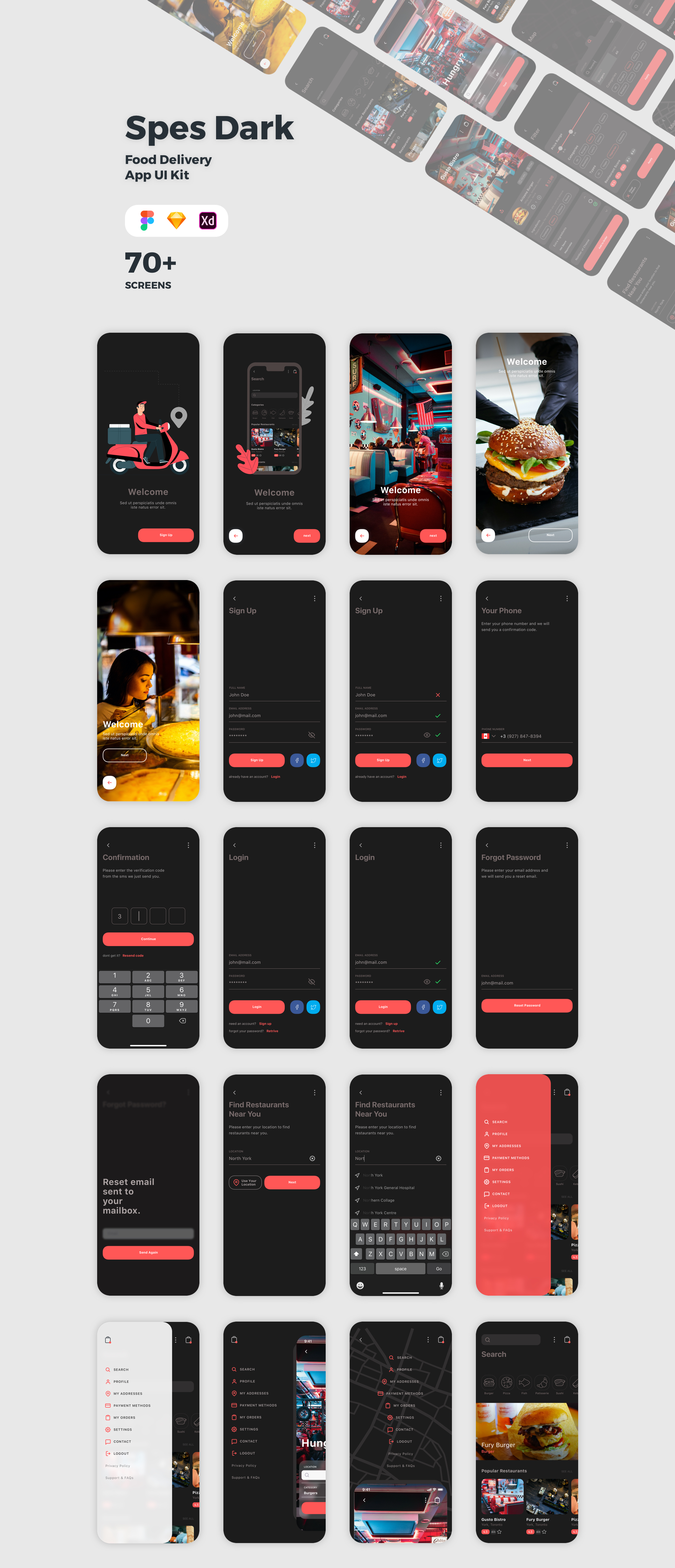 Spes Dark是一个Food Delivery App UI Kit。包括Sketch,Adobe XD和Figma文件。每个屏幕都是完全可定制的,并且用符号组织得很好。它包含74个屏幕。