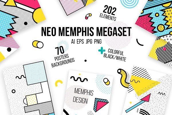 MEMPHIS风格(80-90ss)的时尚多彩系列非常适合贺卡,贴纸,横幅,海报,网络,社交媒体,电子邮件,印刷品等。您可以轻松地将海报中的图块取消分组并组成自己的设计构图。块具有轮廓,您可以轻松地从胖到瘦进行编辑。