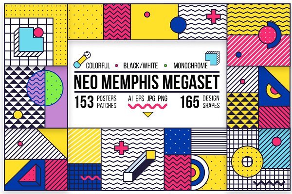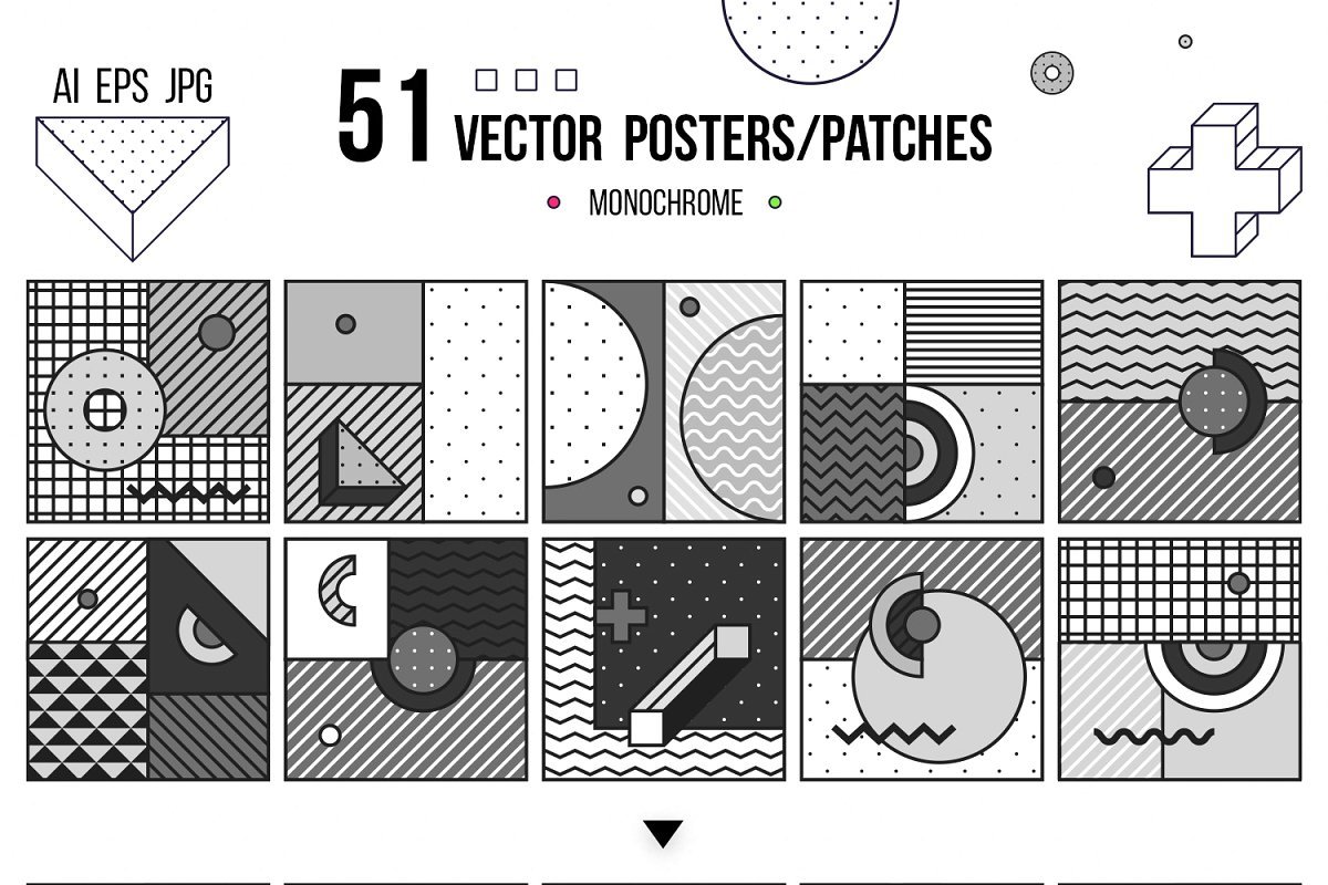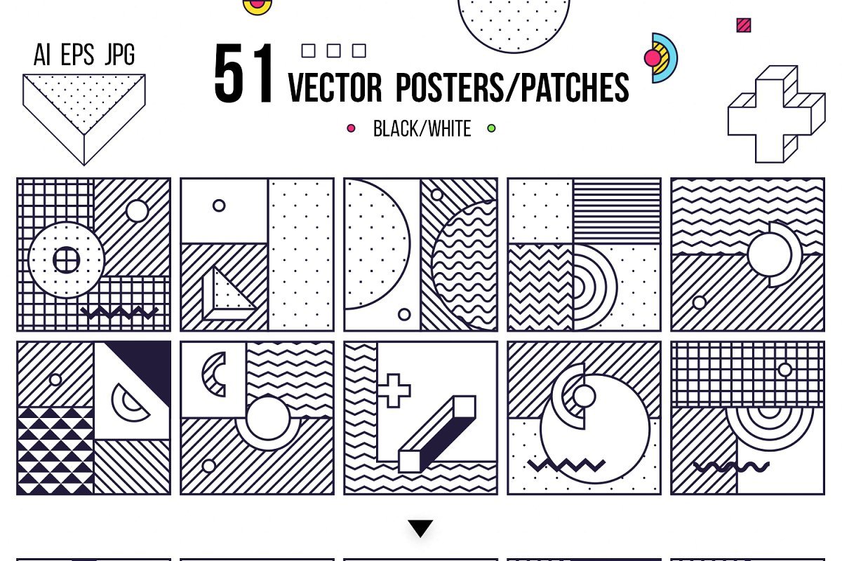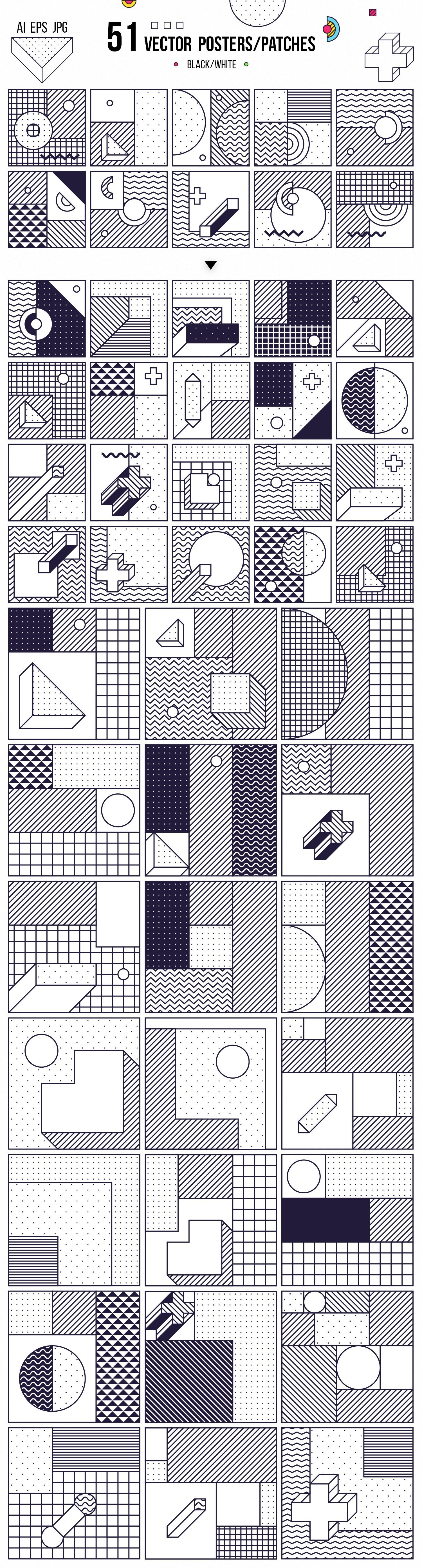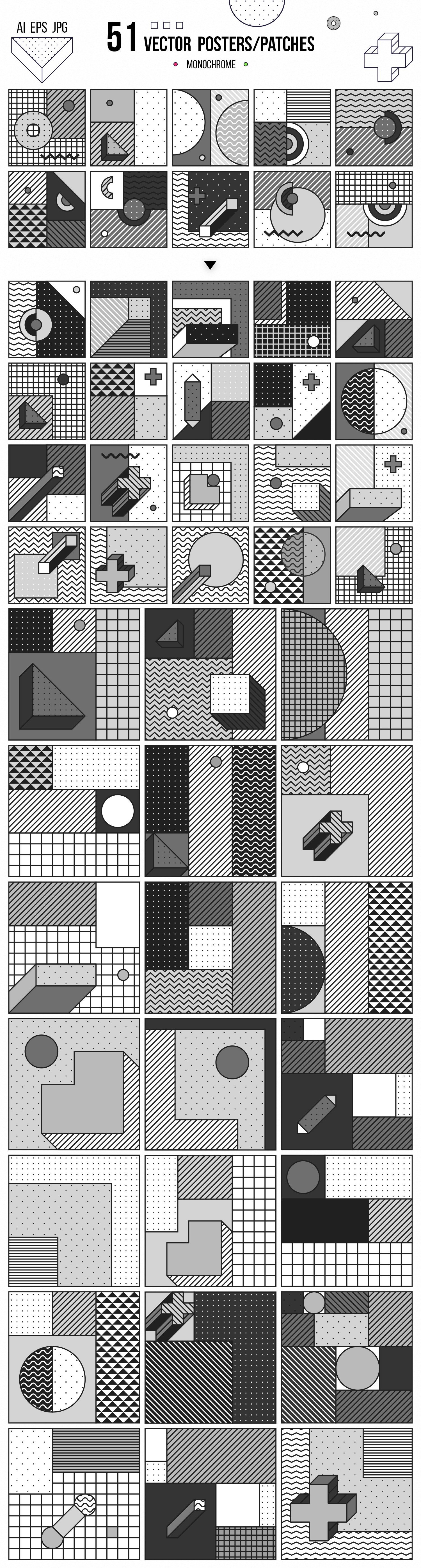 AI中的4个文件(彩色,黑白,单色+ 165种设计形状的153个补丁/海报),RGB