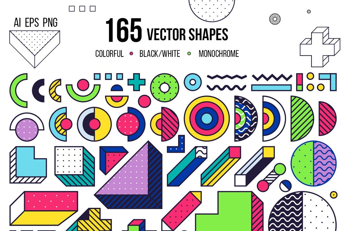 EPS10中的4个文件(彩色,黑白,单色+ 165种设计形状的153个色块/海报),RGB