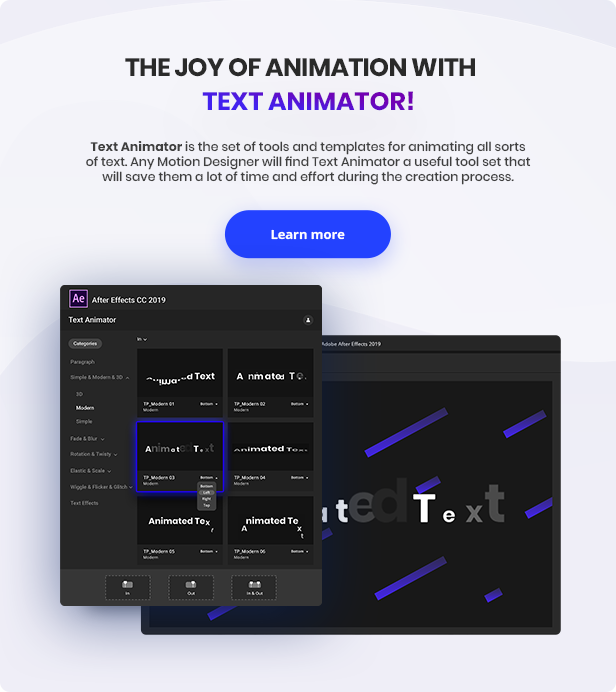 Text Animator是一组工具,这些工具具有用于设置各种文本和标题动画的预设。任何Motion Designer都会发现Text Animator是一个有用的工具集,可以在创建过程中节省大量时间和金钱。