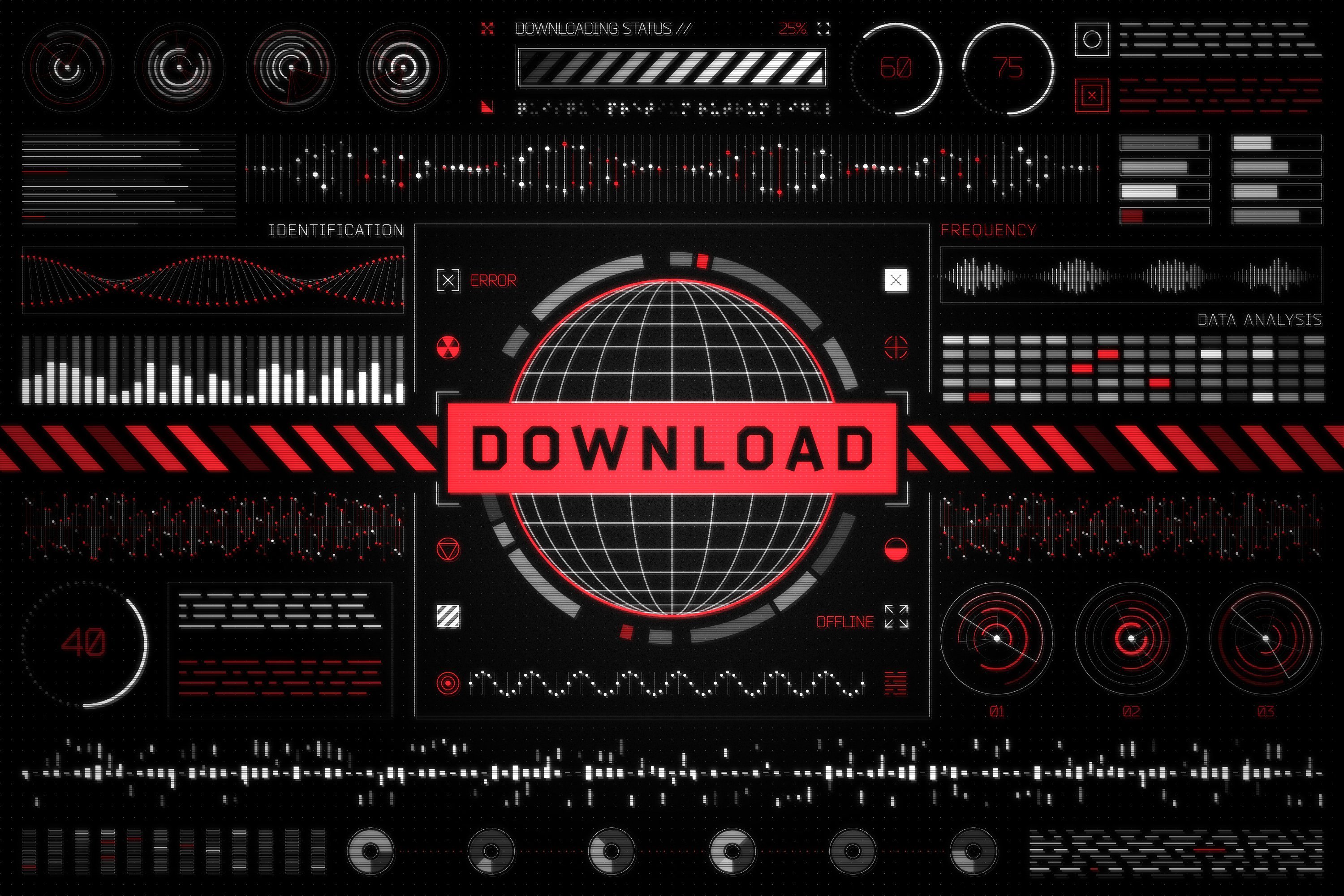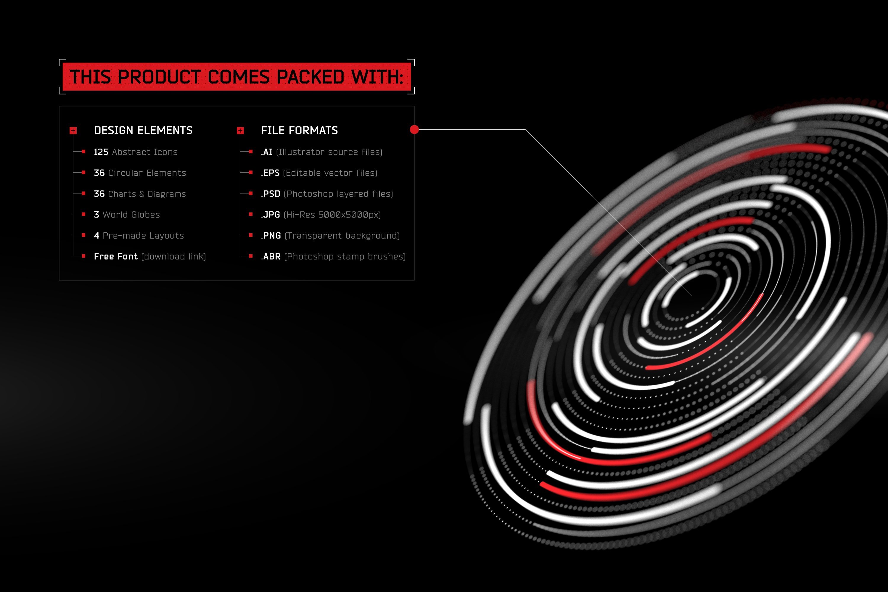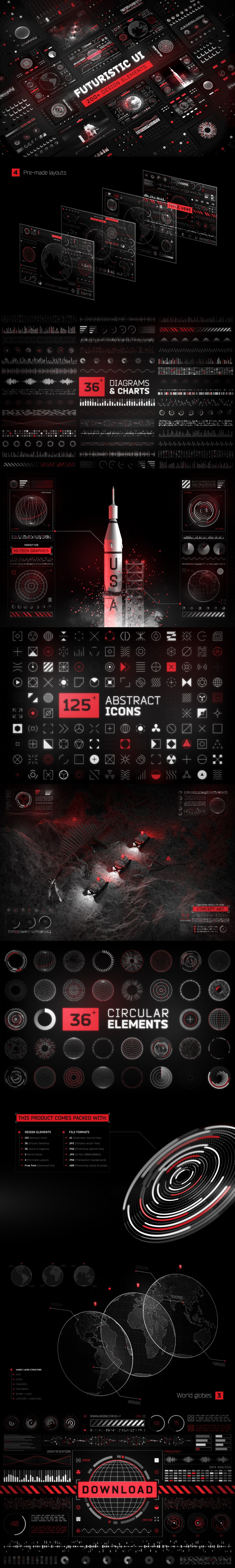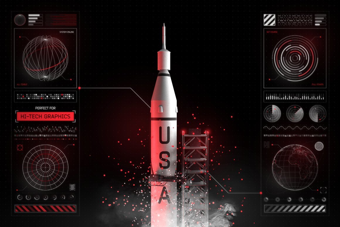 欢迎来到屏幕图形的未来!该产品包含200多种未来派UI设计元素和用于您设计的详细HUD形状。创建具有许多复杂细节的逼真的仪表板,数据显示和信息图形UI屏幕。