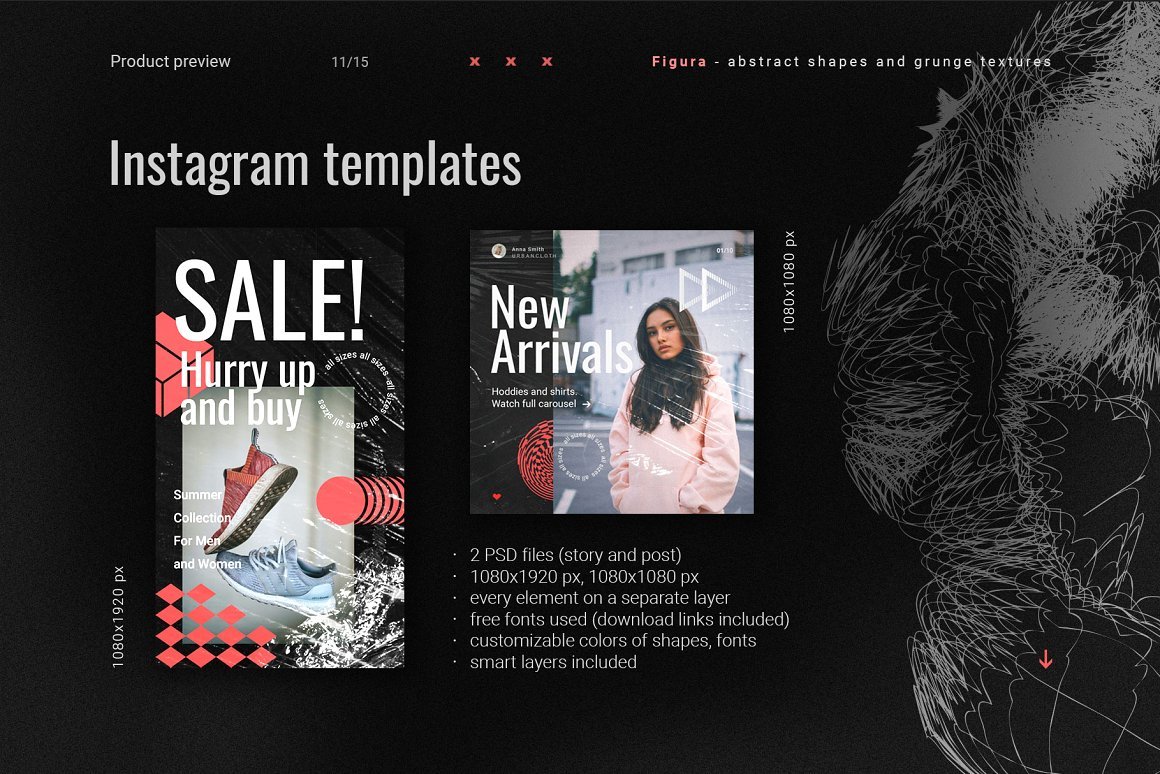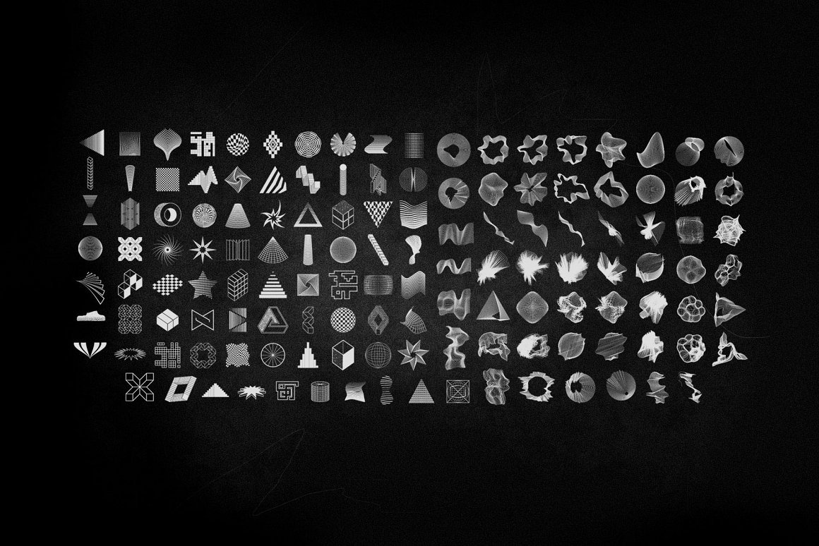 图-一组134个抽象形状(复古和超细线),20个grunge纹理,20个Plasticwrap元素和2个instagram模板。多用途形状以多种格式提供,因此可以用于您需要的分辨率和颜色。结合保鲜膜纹理和垃圾纹理,它们看起来不错。非常适合社交媒体和时装设计。