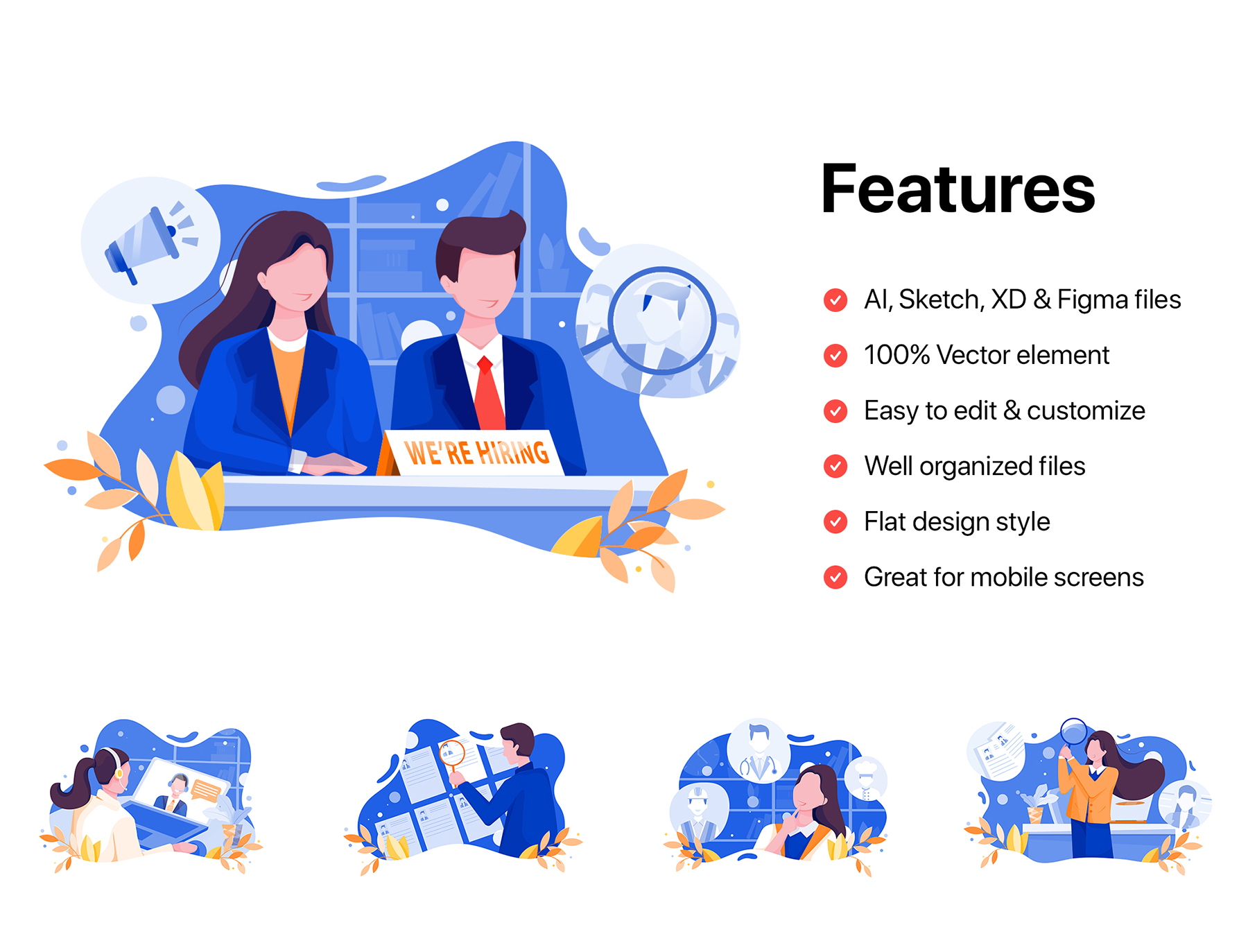 此素材包含10个求职面试主题矢量插画。色彩鲜艳,醒目的设计,可满足您的数字需求。可以轻松调整大小,并根据需要更改每种形状的颜色。用于您的演示文稿,网站,移动应用程序和所有需求。