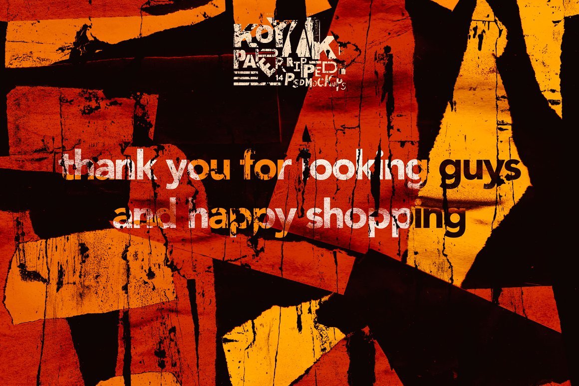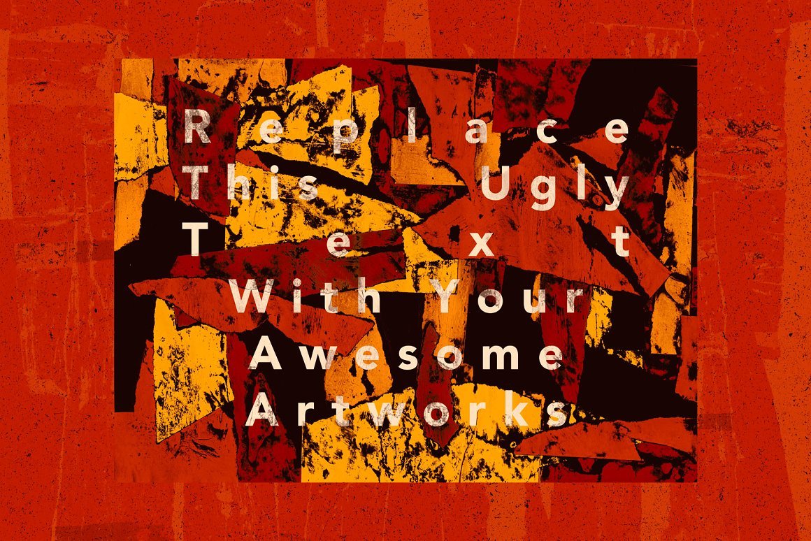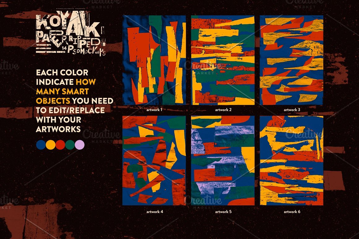 每个智能对象,都可以用排版作品或抽象艺术来填充。您可以轻松获得apper翻录的纹理而无需修改,只需调整其中的纹理层的开/关即可。Koyak也适用于任何一种颜色,黑白,七彩也行得通。模板中撕开的纸张使色彩动态变化,并且艺术品将其融合为一件艺术品。