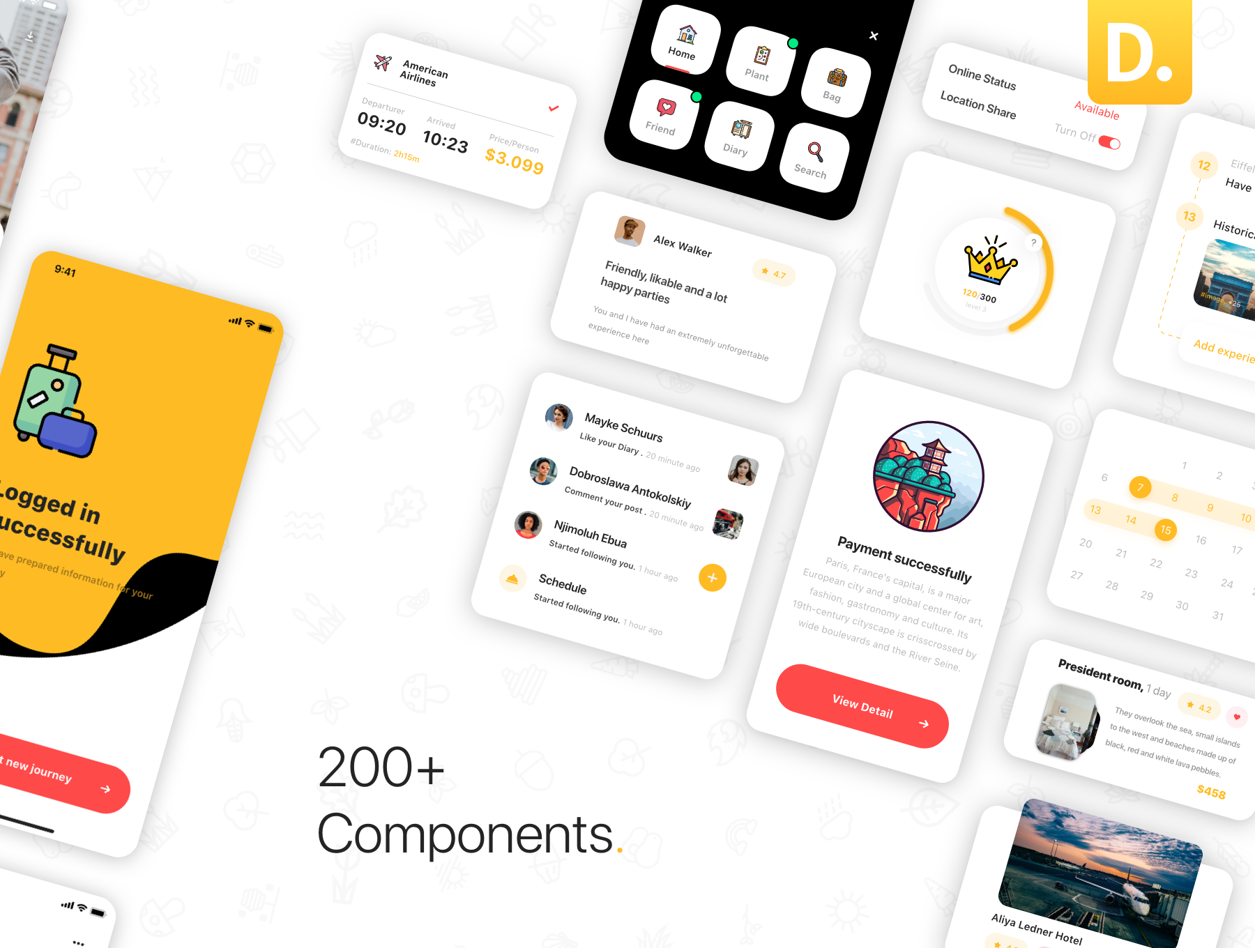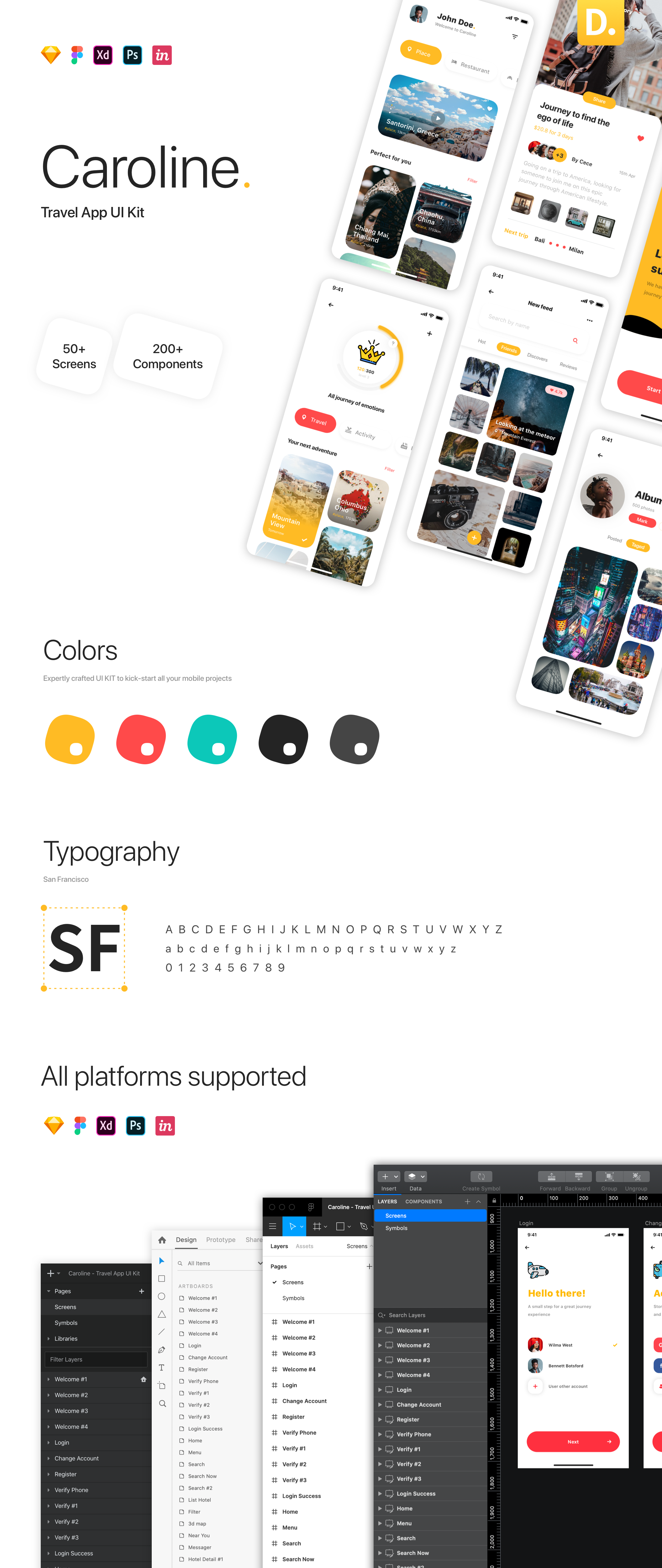 Caroline-Travel App UI Kit是包含50多个屏幕的高质量软件包,旨在启动您的旅行项目并加速您的设计工作流程。该套件与iOS和Android系统100%兼容。精心设计的用户界面与现代设计趋势,新鲜的色彩和出色的用户体验保持一致。