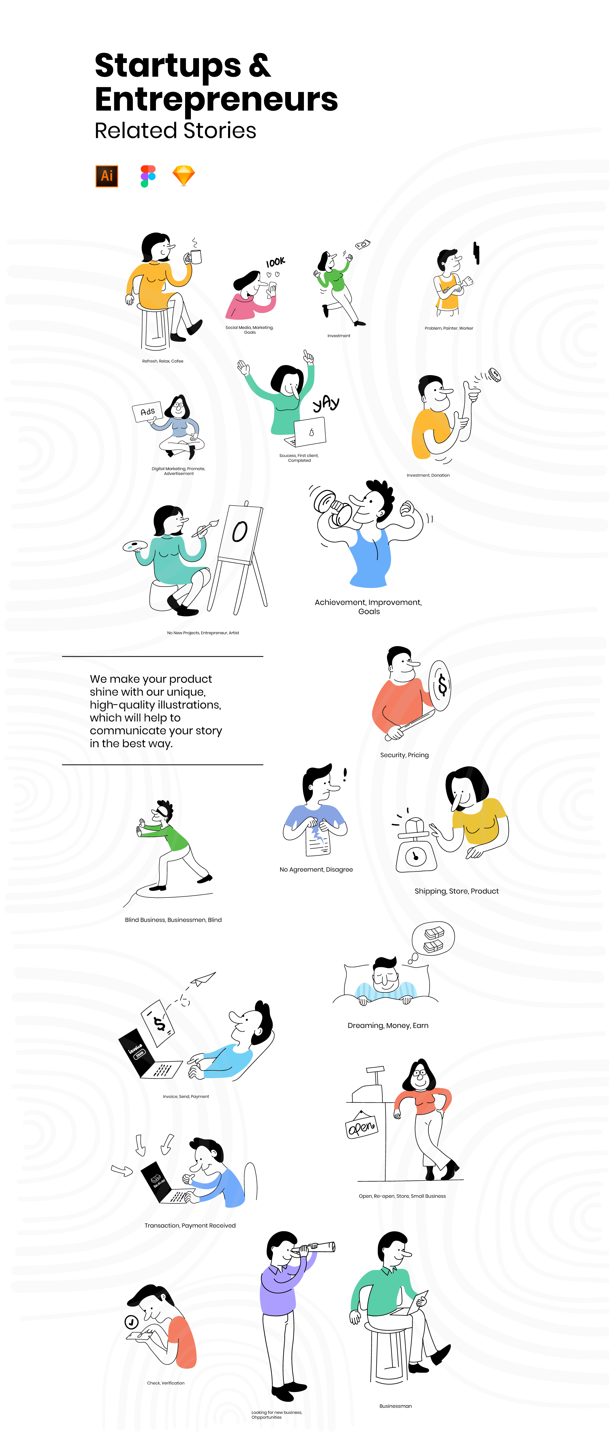 手绘风格(带有3pt的笔触和纯色)使这些功能变得独特而简单。您可以将其用于网站,Web应用程序,移动应用程序,社交媒体,演示文稿或印刷材料。