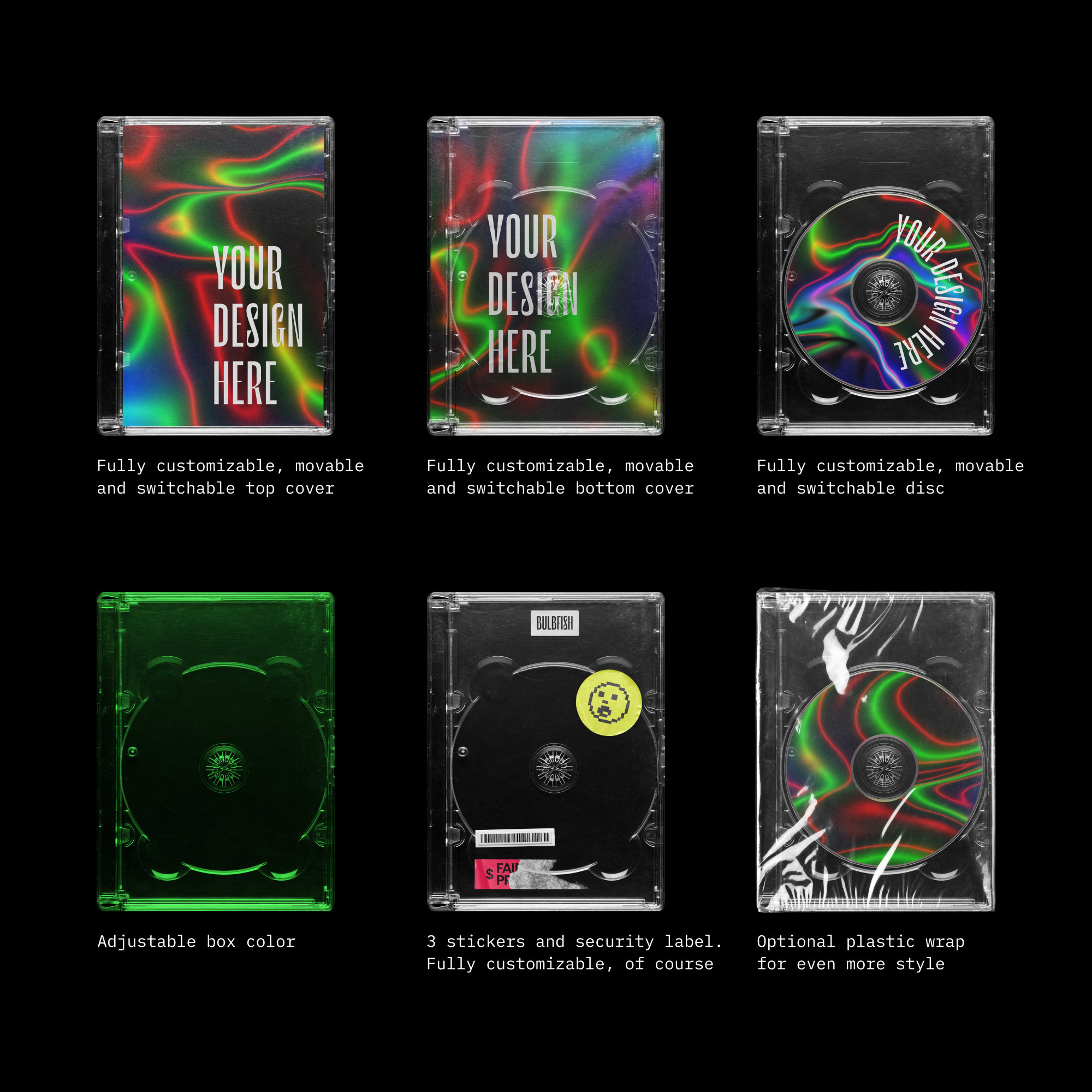 功能性/ 实际上,其中有七个模型:顶盖,底盖,光盘,三个不同的标签和安全标签。将您的设计放在每个位置上,移动,组合并执行您想要的操作。并最终添加随附的塑料包装。