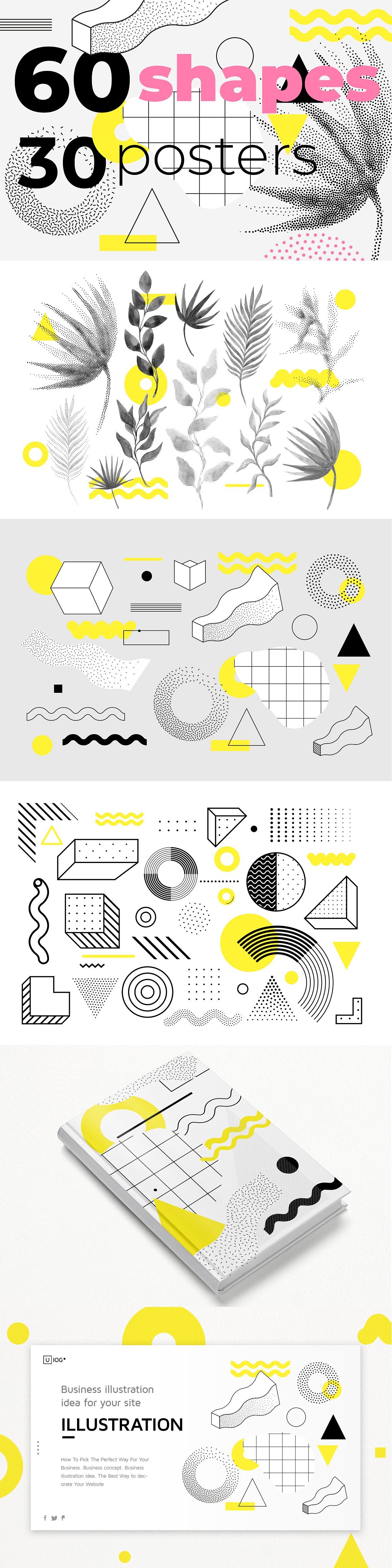 独特的现代风格收藏,包括60种形状,适合您设计的花卉元素以及30种使用形状制作的海报/背景。这套大型套装非常适合动画,贺卡,贴纸,横幅,海报,网络,社交媒体,杂志,传单,广告牌,销售,印刷,品牌等等!