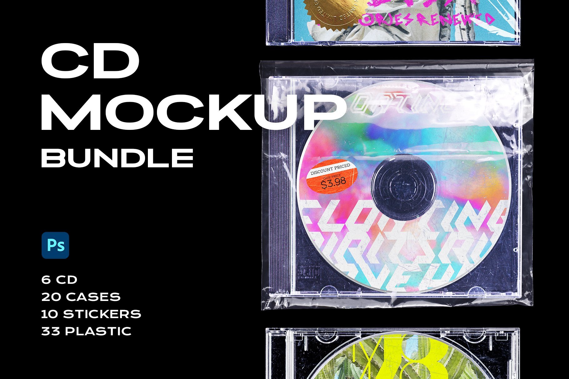 通过此捆绑包,您可以在6000×4000 px高分辨率,300dpi分辨率下为Adobe Photoshop获得6个光盘,20个盒子,10个贴纸,5个塑料袋,4个内装小册子和30个保鲜膜。完全可定制和高质量。