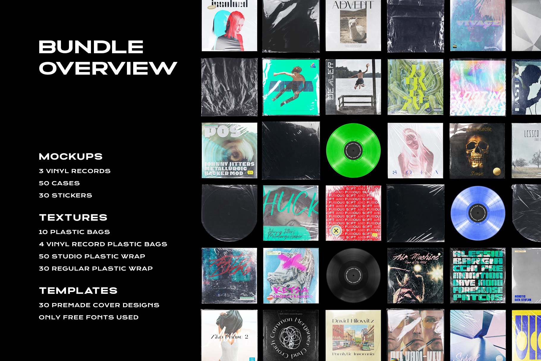 有了这个捆绑包,您可以在高分辨率4000×4000 px,300dpi的分辨率下为Adobe Photoshop获得3个黑胶唱片样机,50个黑胶案件纹理,30个贴纸样机,10个塑料袋和80个保鲜膜纹理。完全可定制和高质量。
