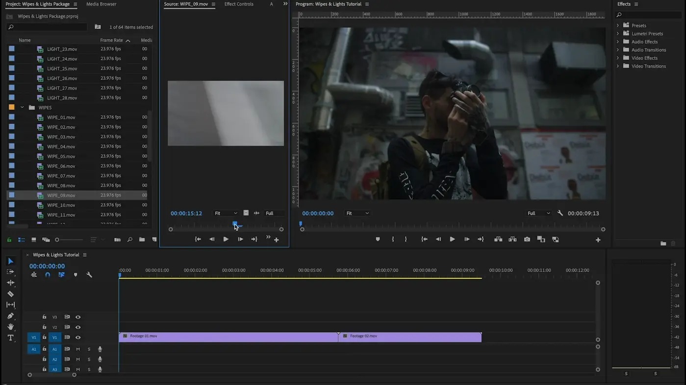 这个包叫做“擦拭和灯光过渡”,但更好的名字是“数字胶”。我们经常在各种项目中使用这些镜头来…是的…将事物粘合在一起。它们具有动态过渡效果,使您的剪辑感觉平滑运动,就好像您的DP刚刚快速平移到下一幅照片一样。