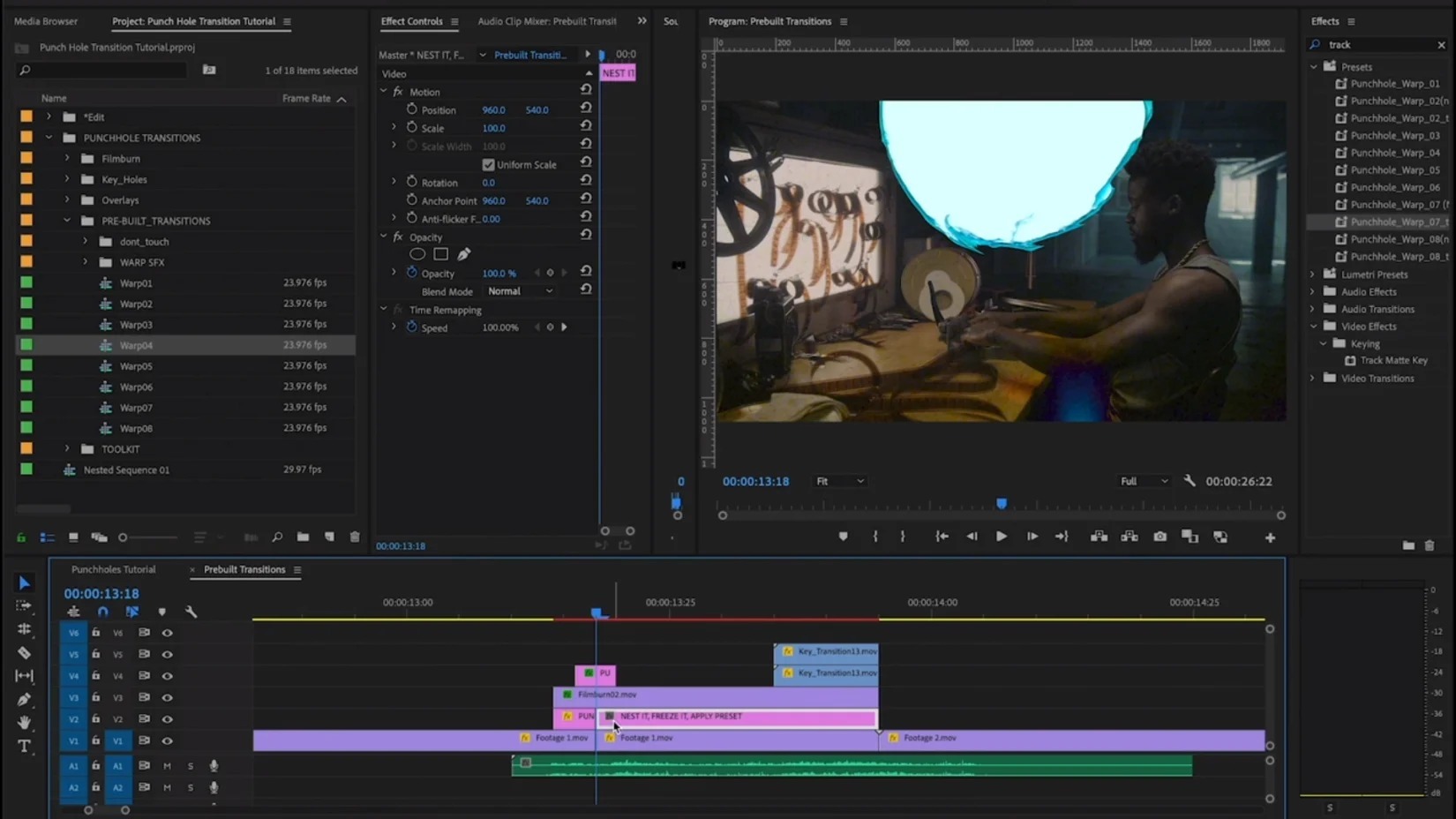 这个包当然围绕着我们无与伦比的过渡。但是它带有15个打孔动画,15个打孔覆盖和3个独特的胶片烧伤。它们已预先设置键,并基于简单的拖放和混合模式。您可以使用它们来隐藏素材的一部分,创建自己的转场或仅向项目添加更多纹理。我们将在本教程中向您展示如何执行此操作。