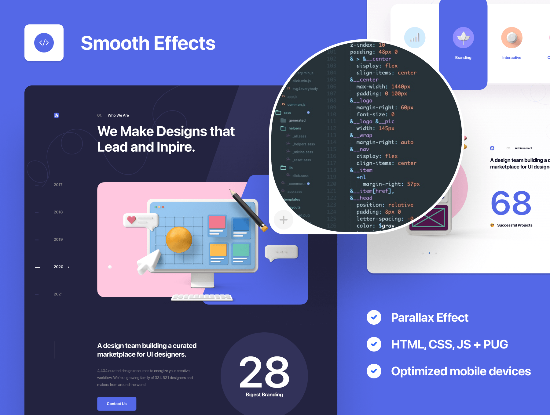 该软件包包括一个具有响应能力的,具有完全动画效果的着陆页模板,其中包括几个交互式部分以及一个“案例研究”页面。拖放,混合不同部分,可在几分钟之内快速构建您的投资组合页面。