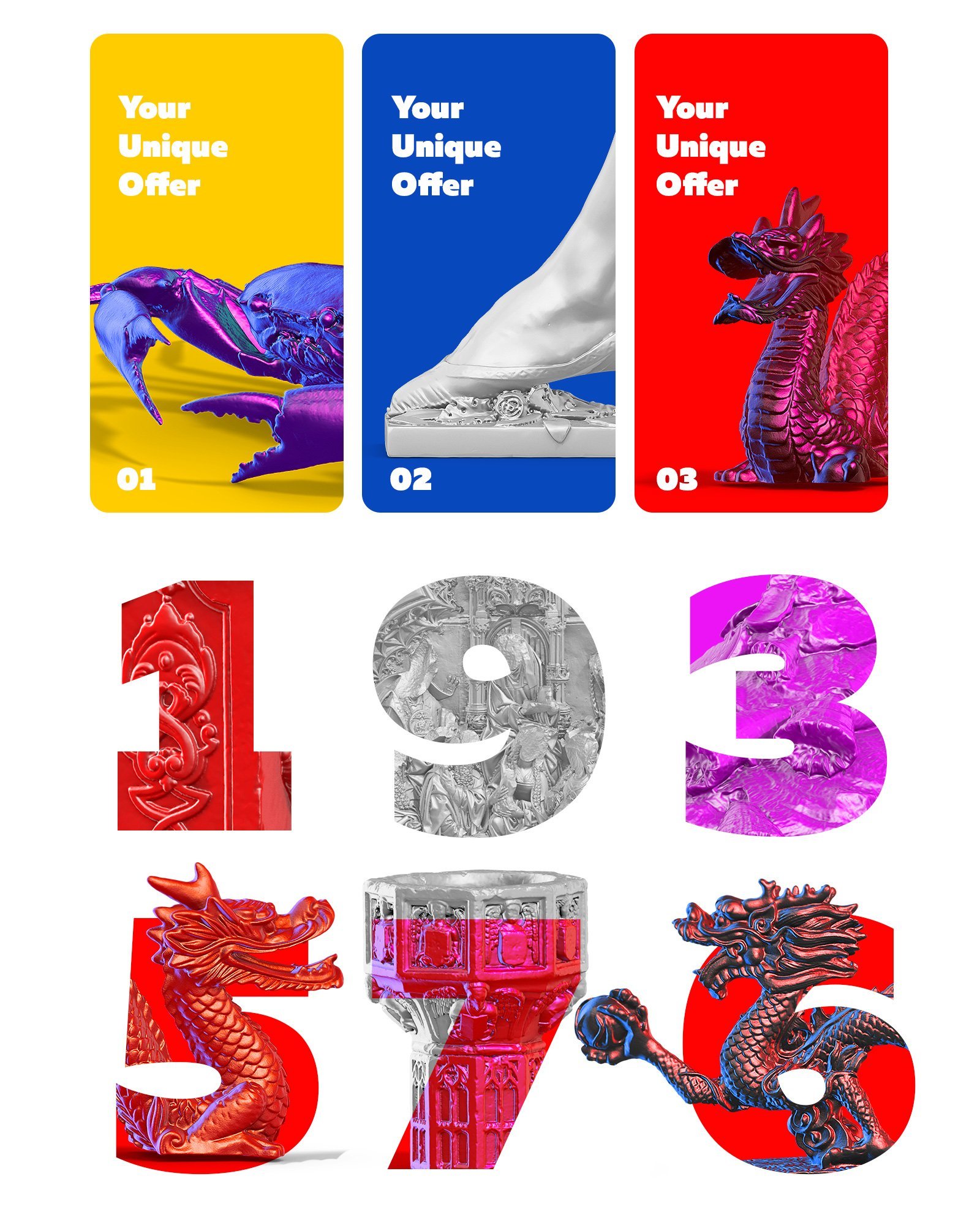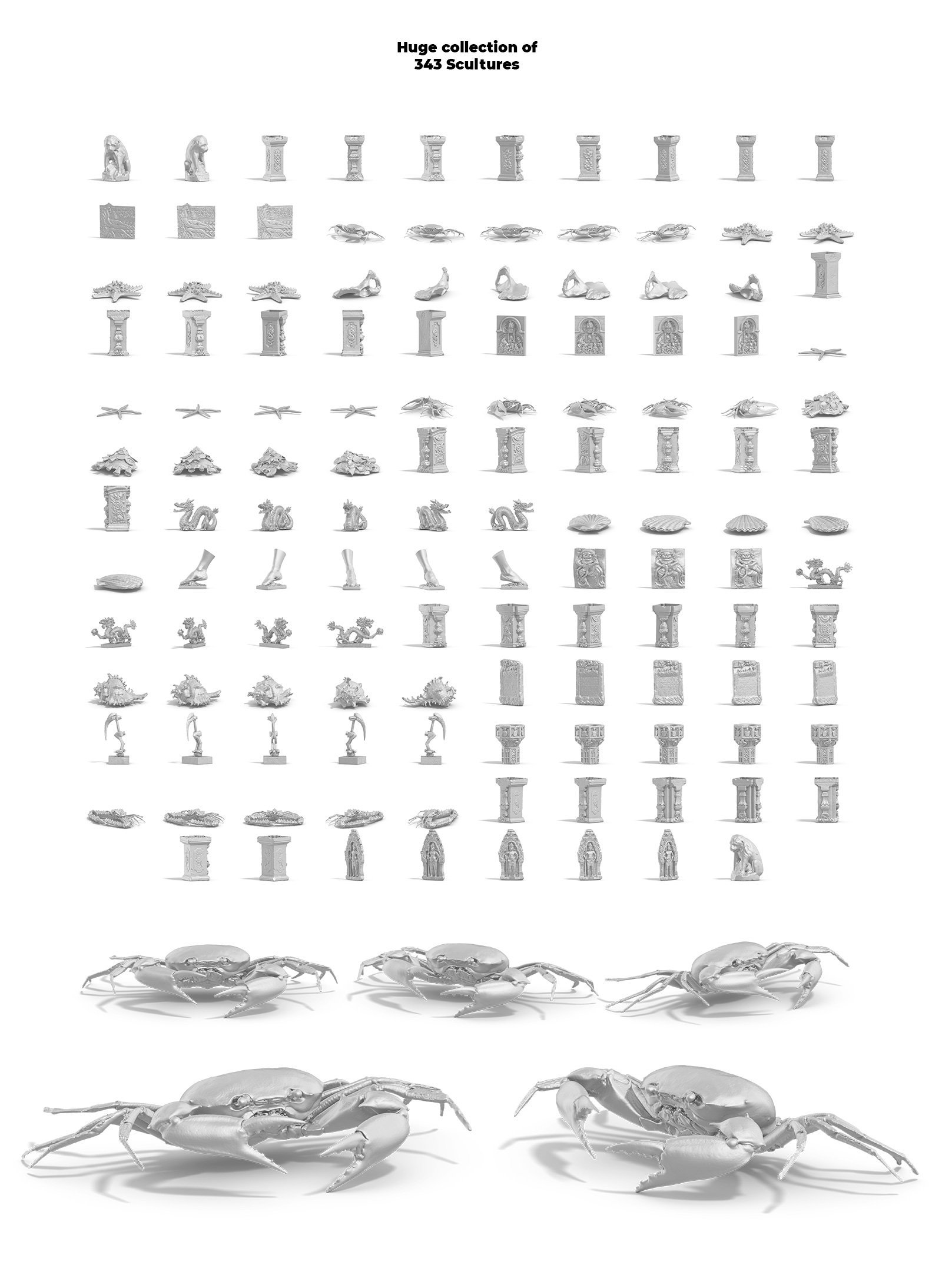 使用这些模拟雕塑来创建您自己的公司标识,应用程序,网页设计,印刷产品,纺织品。所有对象均与背景分离,这使您可以将它们放置在任何背景上,并由独特的图层组成,编辑使您可以创建自己的独特图像。